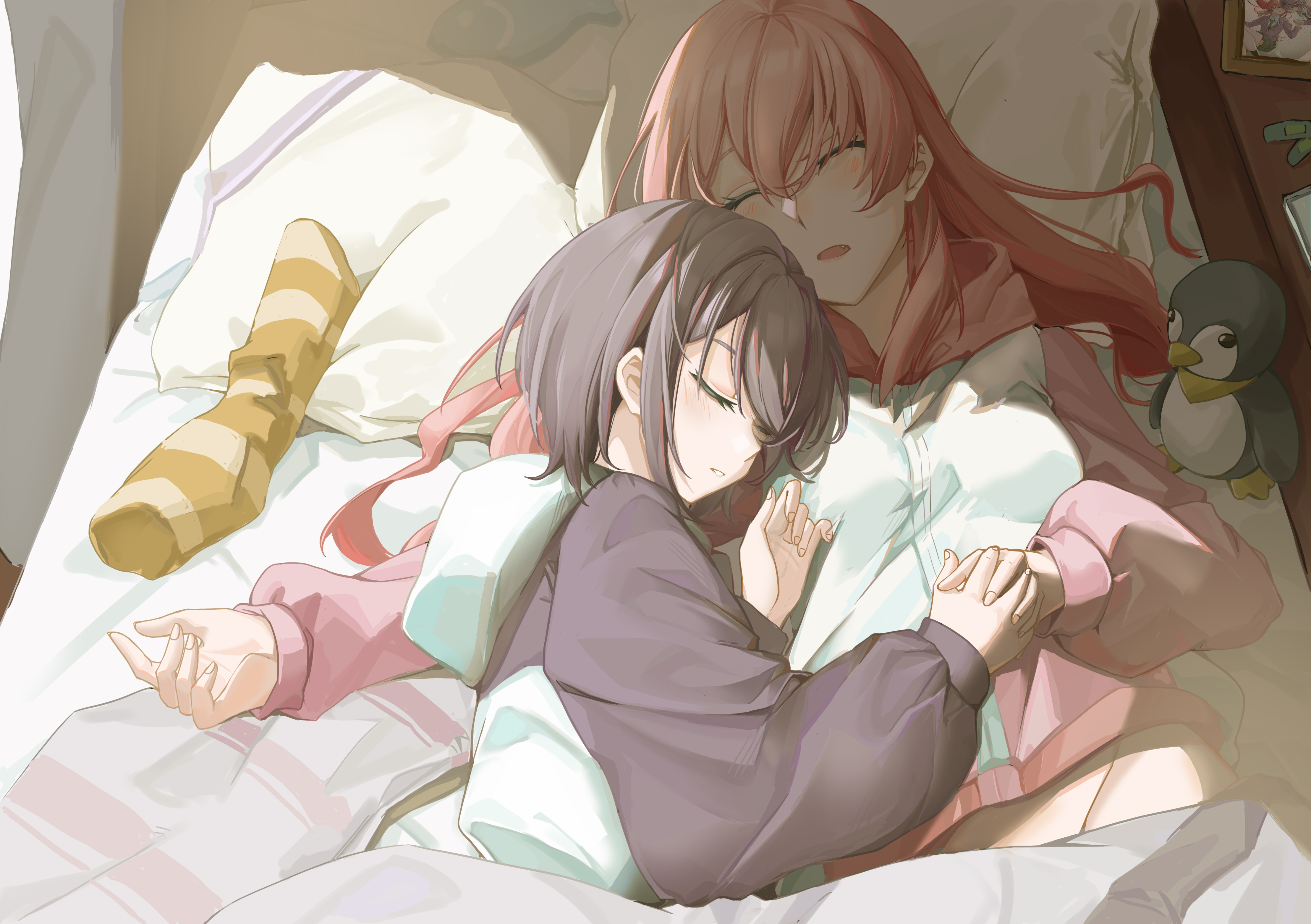 2girls absurdres bandaid bang_dream! bang_dream!_it's_mygo!!!!! blue_hoodie chihaya_anon closed_eyes commentary_request cuddling fang grey_hair grey_hoodie head_on_another's_shoulder highres holding_hands hood hoodie indoors interlocked_fingers long_hair multiple_girls on_bed open_mouth pajamas photo_(object) pink_hair pink_hoodie short_hair sleeping socks stuffed_animal stuffed_penguin stuffed_toy takamatsu_tomori two-tone_hoodie under_covers unworn_socks yuko_(user_uuju2584) yuri