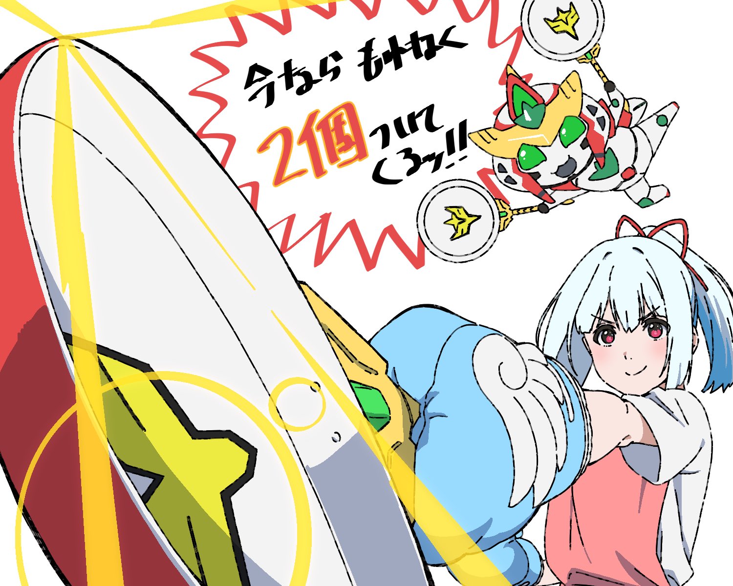 1girl apron bravern chibi frying_pan gloves hair_ribbon highres holding holding_frying_pan long_hair lulu_(bang_bravern) matatabeat ponytail red_eyes ribbon shirt smile white_hair yuuki_bakuhatsu_bang_bravern