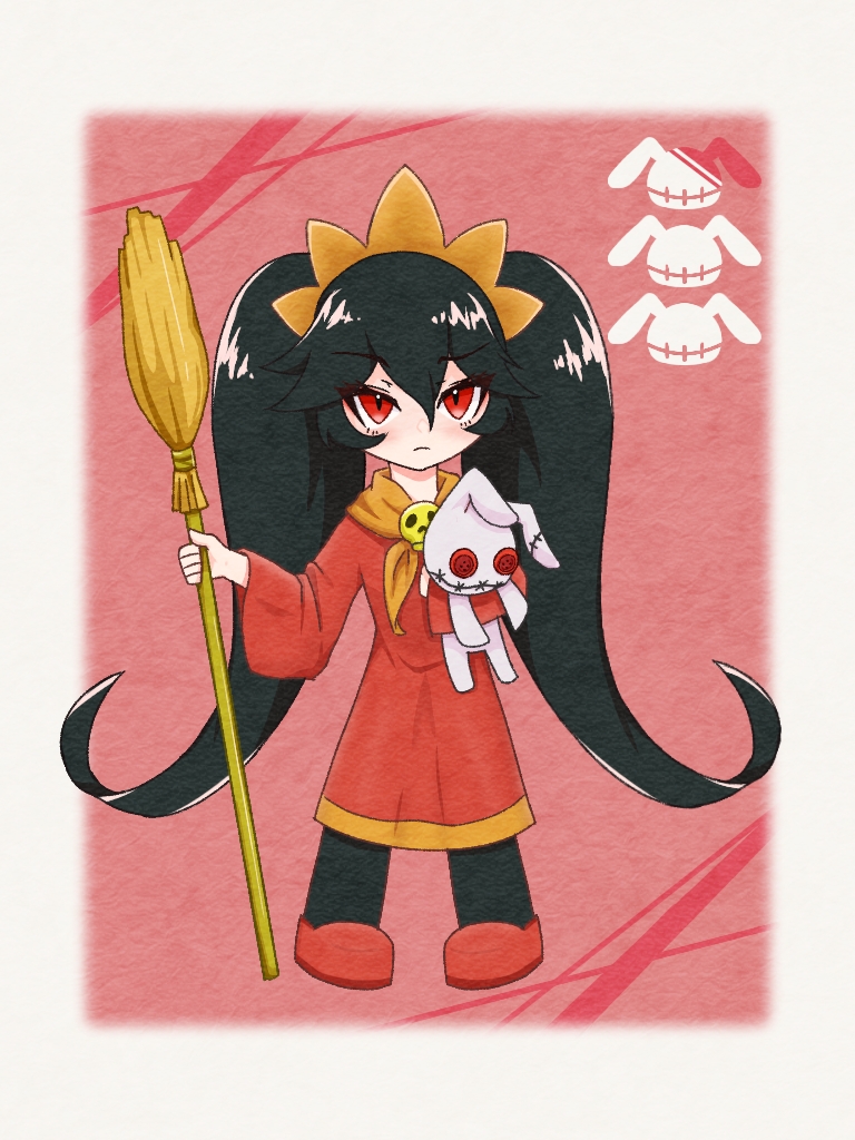 1girl ashley_(warioware) asuta_(pixiv_40186035) big_hair black_hair blush child closed_mouth dress hairband holding long_hair long_sleeves looking_at_viewer neckerchief nintendo orange_hairband pantyhose red_dress red_eyes simple_background skull solo stuffed_animal stuffed_toy tiara twintails very_long_hair warioware warioware:_move_it!