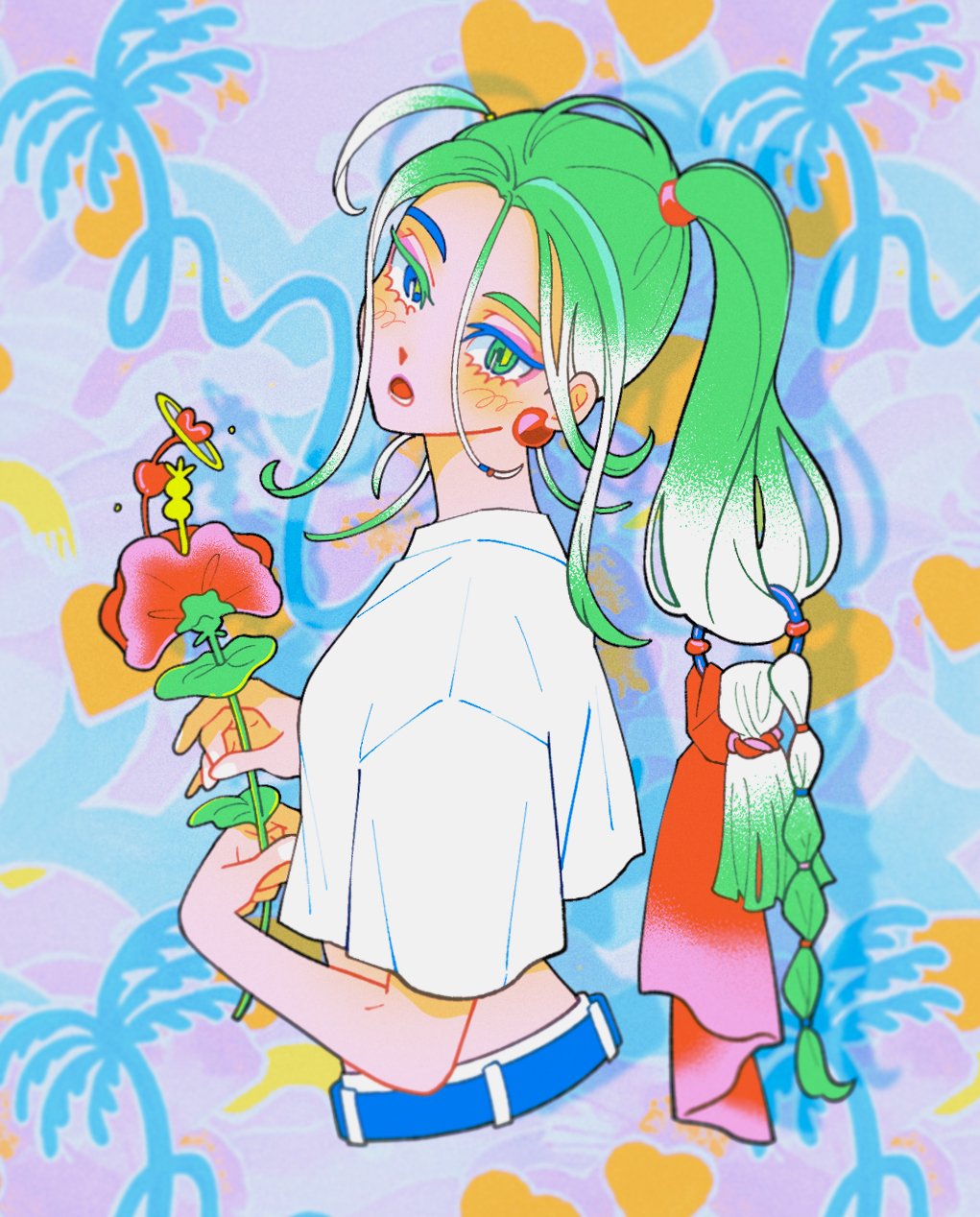 1girl abstract_background blue_eyes blush colored_eyelashes commentary_request crop_top crop_top_overhang cropped_torso earrings eyelashes flower from_side green_eyes green_hair hair_ornament heterochromia highres holding holding_flower inuha_dog_wave jewelry long_hair looking_at_viewer looking_to_the_side midriff mismatched_eyebrows mismatched_eyelashes open_mouth original red_flower shirt short_sleeves solo sphere_earrings upper_body white_shirt