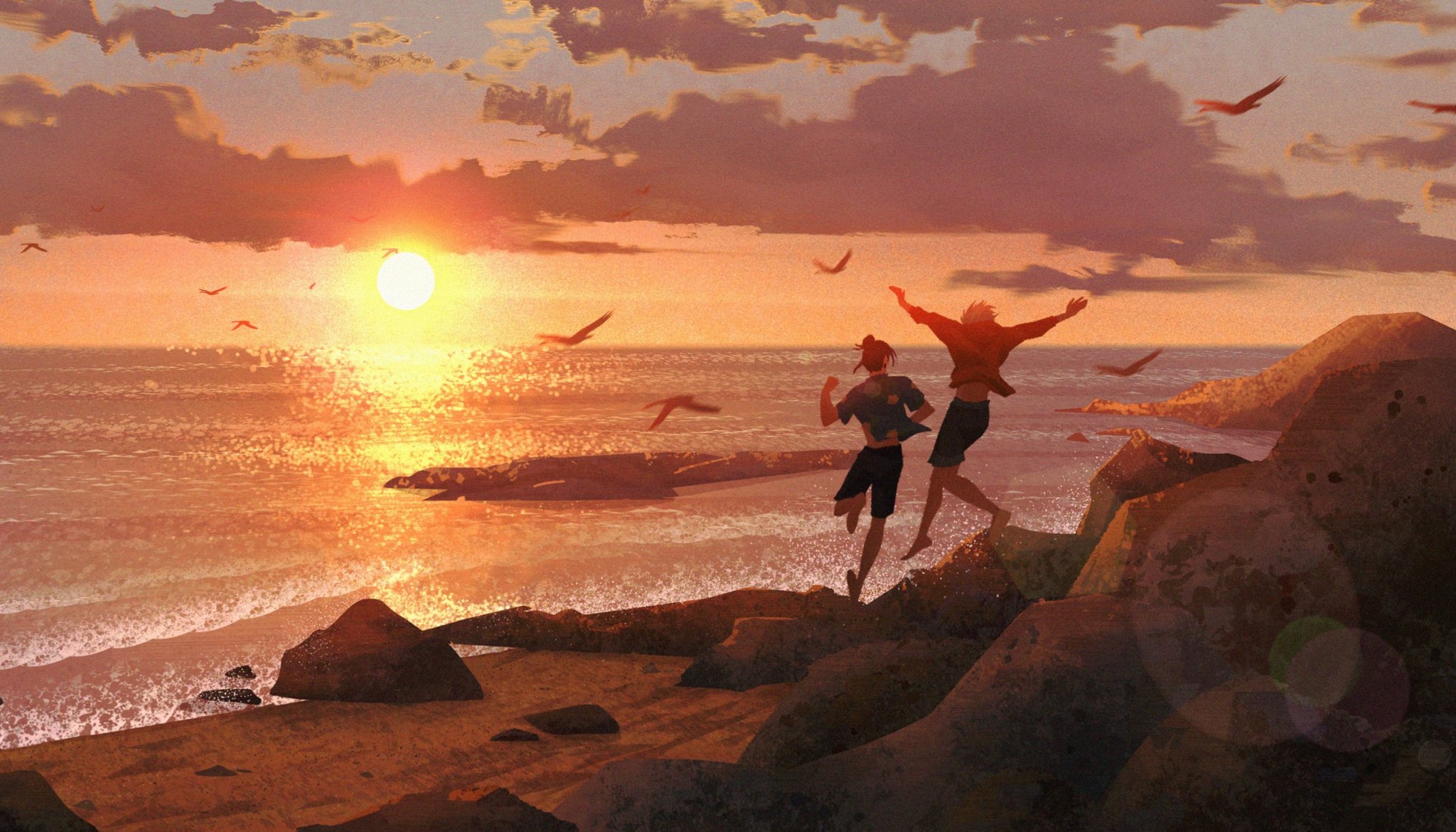 2boys arms_up barefoot beach bird black_hair blue_shirt blurry bokeh boulder clenched_hand cloud cloudy_sky day depth_of_field facing_away film_grain geto_suguru gojo_satoru hair_bun highres horizon jujutsu_kaisen jumping multiple_boys ocean open_hand outdoors outstretched_arms poupee_(capo_sung) red_shirt rock running sand scenery shirt short_hair shorts sky sun sunlight sunset water waves white_hair