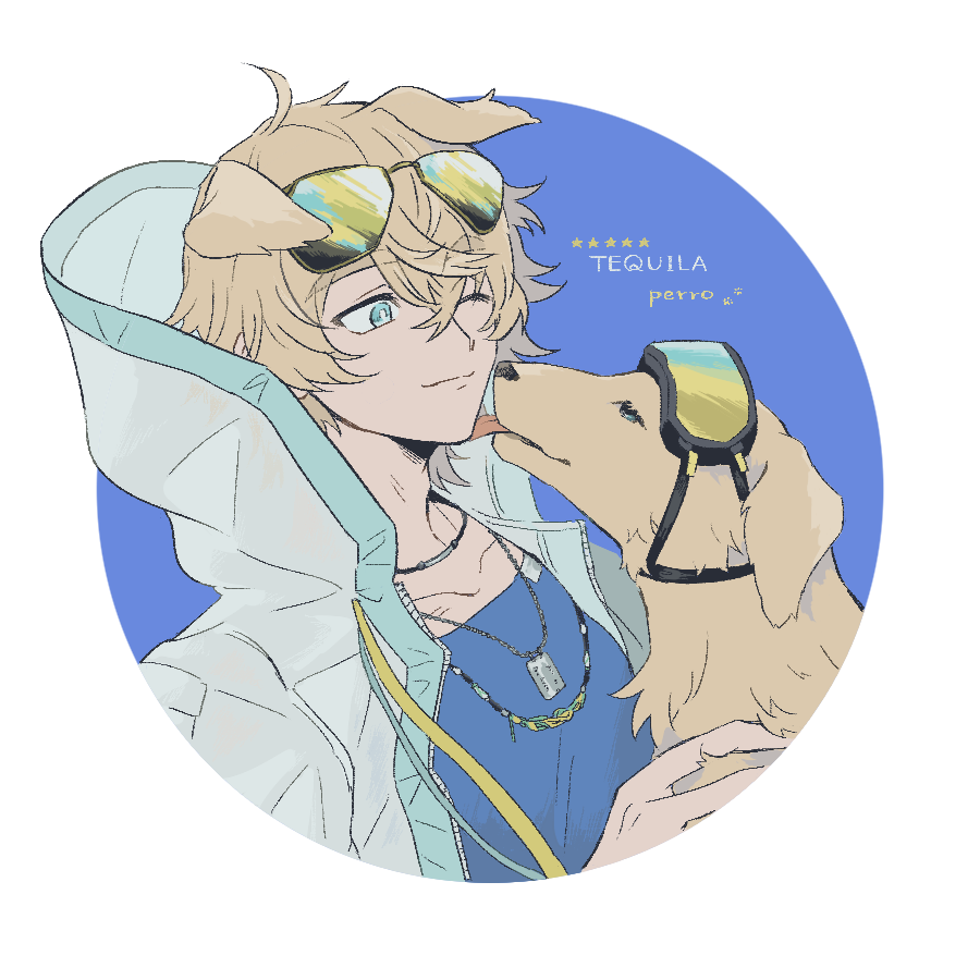 1boy animal animal_ears arknights blue_eyes blue_shirt brown_hair character_name closed_mouth coat collarbone dog dog_ears dog_tags eyewear_on_head goggles hood hooded_coat jewelry male_focus necklace one_eye_closed round_border shirt short_hair sirakaro ski_goggles solo tequila_(arknights) transparent_background white_coat