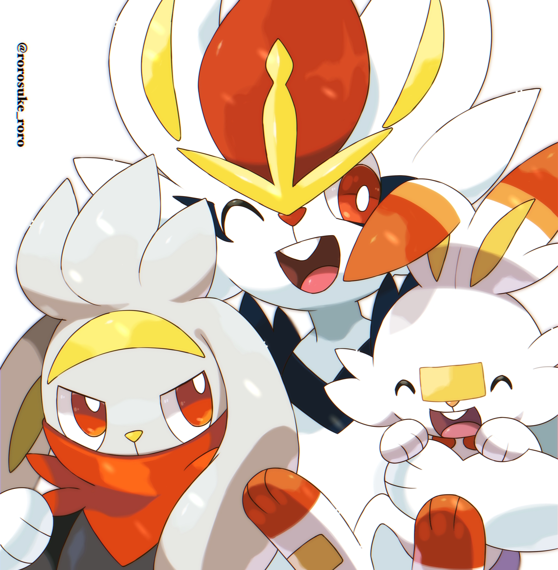 carrying cinderace evolutionary_line gen_8_pokemon highres nintendo no_humans one_eye_closed pokemon pokemon_(creature) raboot red_eyes rorosuke scorbunny signature simple_background smile twitter_username white_background