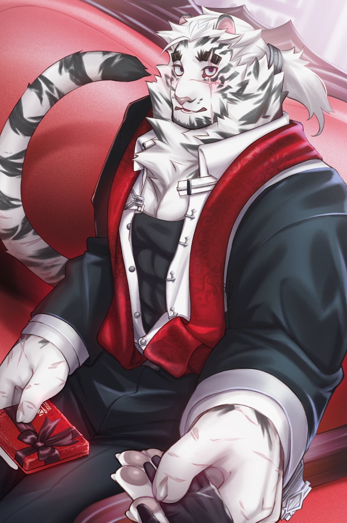 1boy alternate_costume animal_ears arknights bara blush box couch facial_hair furry furry_male gift gift_box goatee hand_size_difference happy high_ponytail highres holding_hands incoming_gift large_hands male_focus mountain_(arknights) muscular muscular_male on_couch outstretched_arm pants pectoral_cleavage pectorals ponytail reaching reaching_towards_viewer scar scar_across_eye scar_on_face short_hair solo_focus susabi_(susabi_3b) thick_eyebrows tiger_boy tiger_ears valentine white_fur white_hair