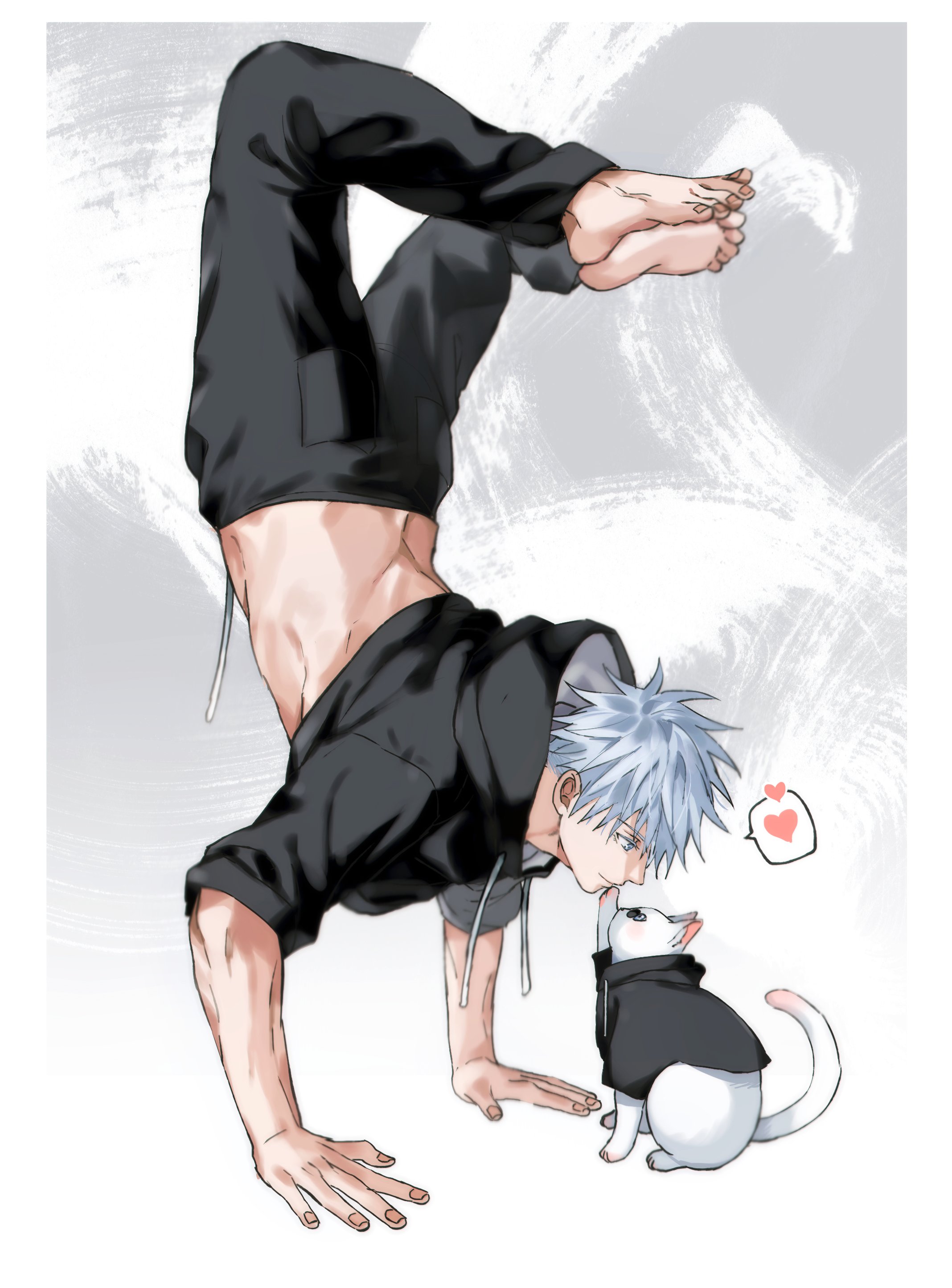 1boy absurdres barefoot black_hoodie black_pants blue_eyes cat closed_mouth drawstring fingernails full_body gojo_satoru grey_hair handstand heart highres hood hoodie jujutsu_kaisen looking_at_animal male_focus pants pocket short_hair speech_bubble spoken_heart toenails yoon_(dmsco1803)