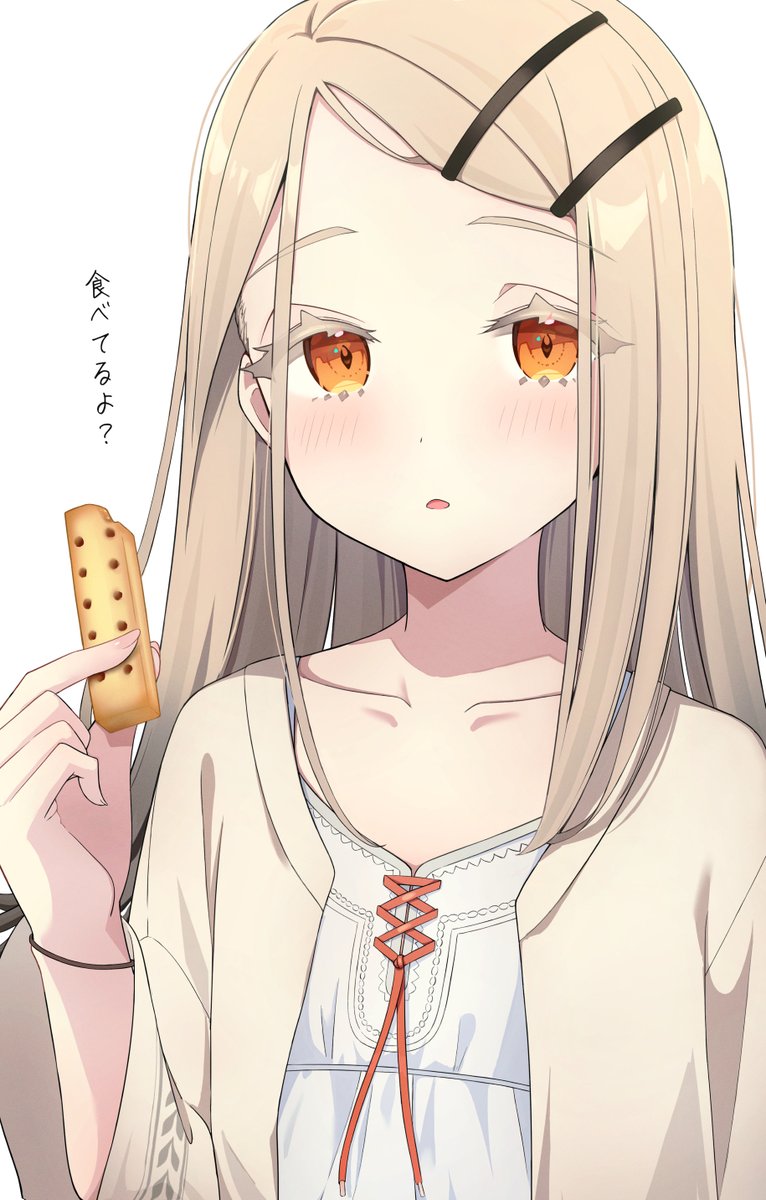 1girl blonde_hair blush caloriemate camisole collarbone expressionless flat_chest food gakuen_idolmaster hair_ornament hairclip highres idolmaster jacket long_hair looking_at_viewer open_clothes open_jacket orange_eyes parted_lips sasai_nakoto shinosawa_hiro simple_background solo upper_body white_background white_camisole