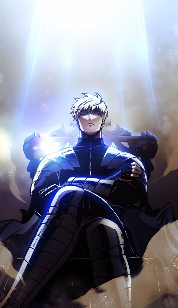 1boy armor black_armor boots closed_mouth crossed_arms crossed_legs doom_breaker highres long_hair looking_at_viewer serious sitting solo white_eyes white_hair zephyr_(doom_breaker)