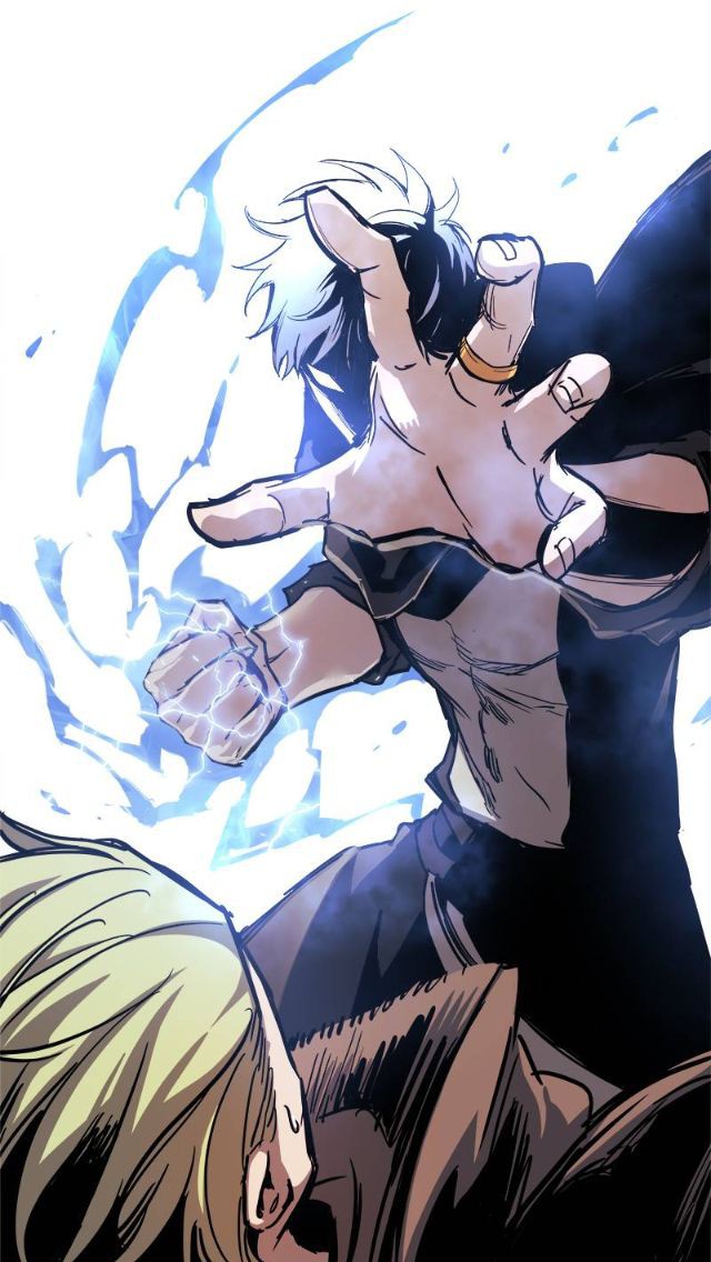 2boys black_pants black_shirt blonde_hair brown_shirt closed_mouth doom_breaker electricity long_hair looking_at_another multiple_boys pants punching serious shirt simple_background white_background white_eyes white_hair zephyr_(doom_breaker)