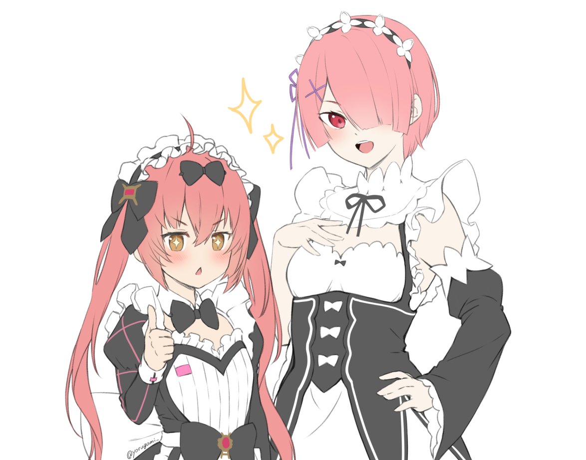 2girls :d ahoge apron black_bow blush bow breasts cocoa_(nikke) goddess_of_victory:_nikke hair_bow hair_ornament hair_ribbon hand_on_own_chest hand_on_own_hip juliet_sleeves long_hair long_sleeves maid maid_apron maid_headdress multiple_girls multiple_hair_bows open_mouth pink_hair puffy_sleeves purple_ribbon ram_(re:zero) re:zero_kara_hajimeru_isekai_seikatsu ribbon roswaal_mansion_maid_uniform simple_background small_breasts smile sparkle sparkling_eyes thumbs_up triangle_mouth twintails white_apron white_background x_hair_ornament yellow_eyes yorugami_rei
