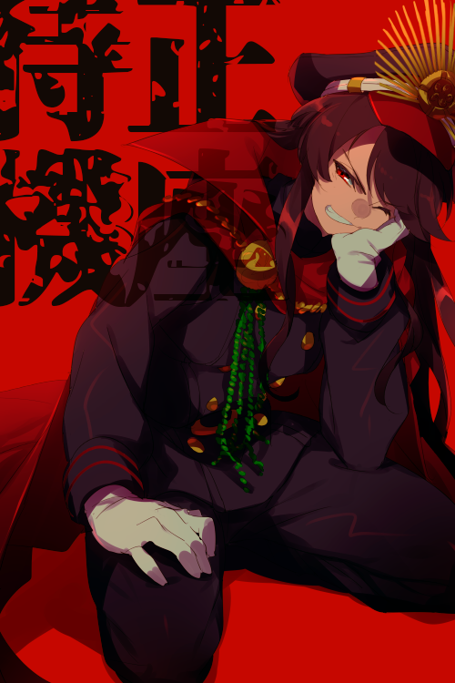1girl belt black_hair black_hat black_jacket black_pants breasts buttons cape chain echo_(circa) fate/grand_order fate_(series) gloves grin hat jacket kneeling koha-ace long_hair long_sleeves looking_at_viewer medallion oda_nobunaga_(fate) oda_nobunaga_(koha-ace) oda_uri one_eye_closed pants peaked_cap popped_collar red_cape red_eyes small_breasts smile solo translation_request white_gloves