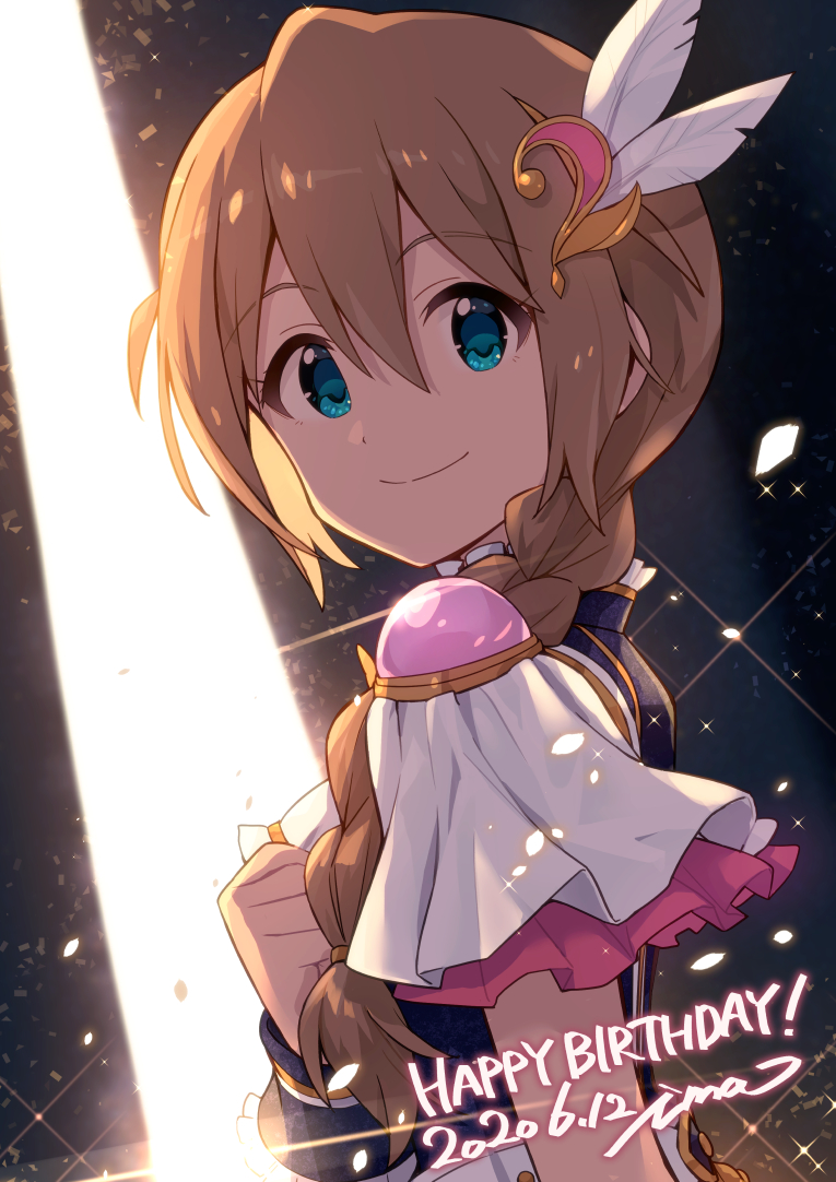 1girl 2020 aqua_eyes artist_name baba_konomi backstage braid breasts brown_hair dated dot_nose eyelashes feather_hair_ornament feathers frilled_shirt frilled_shirt_collar frilled_sleeves frills hair_between_eyes hair_ornament hand_on_own_chest happy_birthday idolmaster idolmaster_million_live! idolmaster_million_live!_theater_days ima_(lm_ew) light_smile long_hair looking_at_viewer lumiere_papillon_(idolmaster) official_alternate_costume shirt short_sleeves side_braid sidelocks single_braid small_breasts solo sparkle upper_body