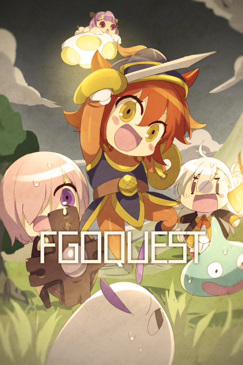 4girls ahoge armor chibi echo_(circa) fate/grand_order fate_(series) fujimaru_ritsuka_(female) grass hair_over_one_eye helena_blavatsky_(fate) helmet long_hair mash_kyrielight mash_kyrielight_(demi-servant) medjed_(fate) multiple_girls nitocris_(swimsuit_assassin)_(fate) nitocris_(swimsuit_assassin)_(first_ascension)_(fate) olga_marie_animusphere open_mouth orange_eyes orange_hair pink_hair purple_eyes purple_hair shield short_hair slime_(creature) smile sword ufo weapon white_hair