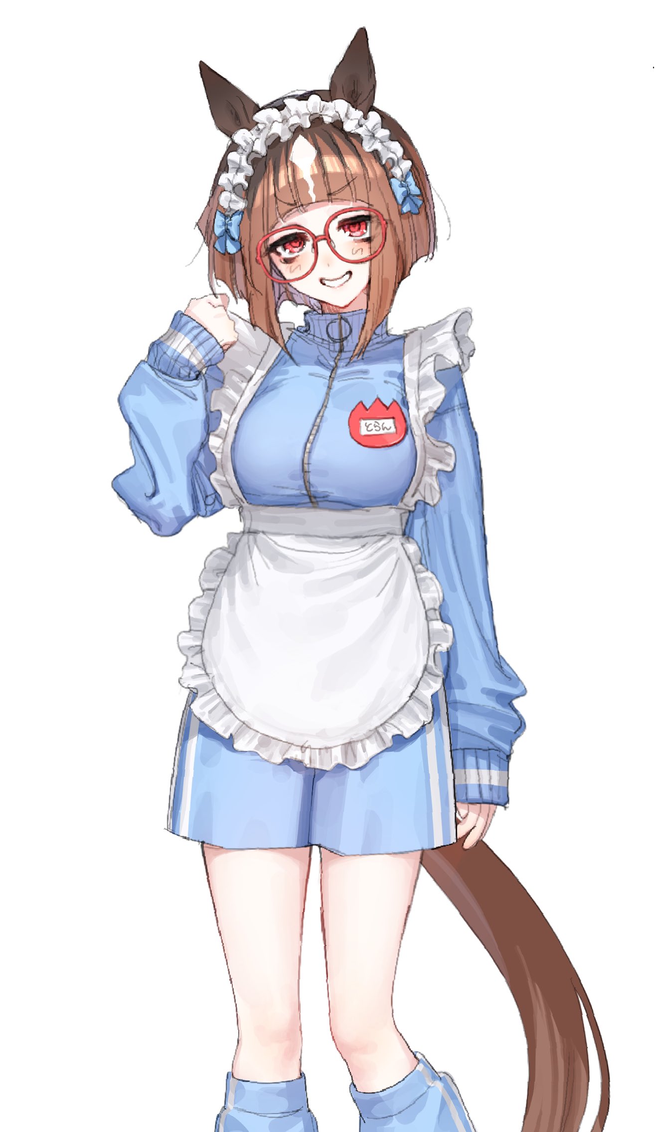 1girl animal_ears apron arm_at_side blue_jacket blue_shorts blush breasts brown_hair feet_out_of_frame frilled_hairband frills glasses grin hairband hand_up highres horse_ears horse_girl horse_tail jacket jersey_maid leg_warmers long_sleeves looking_at_viewer maid medium_breasts name_tag ningen3333 red_eyes short_hair shorts simple_background sleeves_past_wrists smile solo tail transcend_(umamusume) umamusume unconventional_maid v-shaped_eyebrows waist_apron white_background