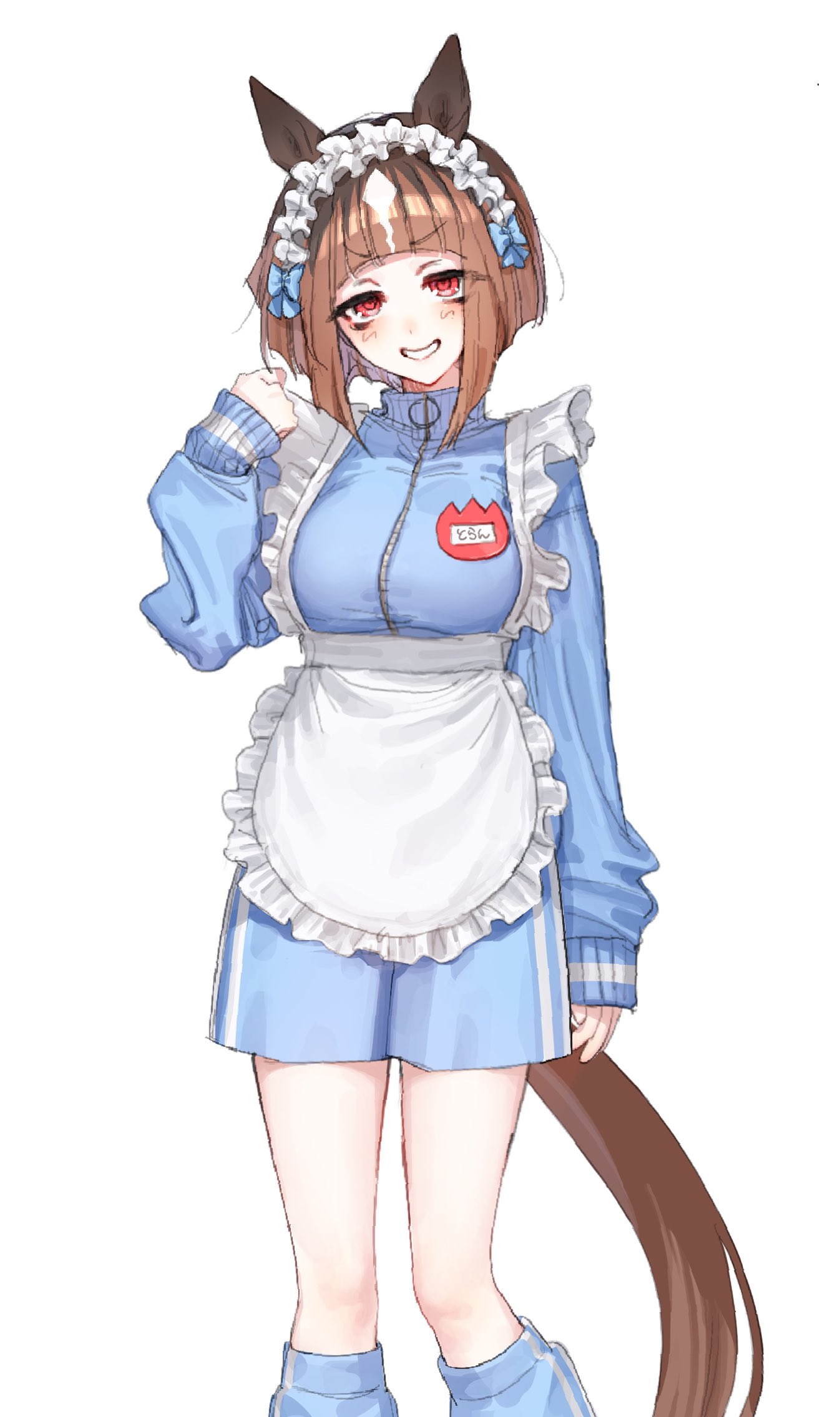 1girl animal_ears apron arm_at_side blue_jacket blue_shorts blush breasts brown_hair feet_out_of_frame frilled_hairband frills grin hairband hand_up highres horse_ears horse_girl horse_tail jacket jersey_maid leg_warmers long_sleeves looking_at_viewer maid medium_breasts name_tag ningen3333 red_eyes short_hair shorts simple_background sleeves_past_wrists smile solo tail transcend_(umamusume) umamusume unconventional_maid v-shaped_eyebrows waist_apron white_background