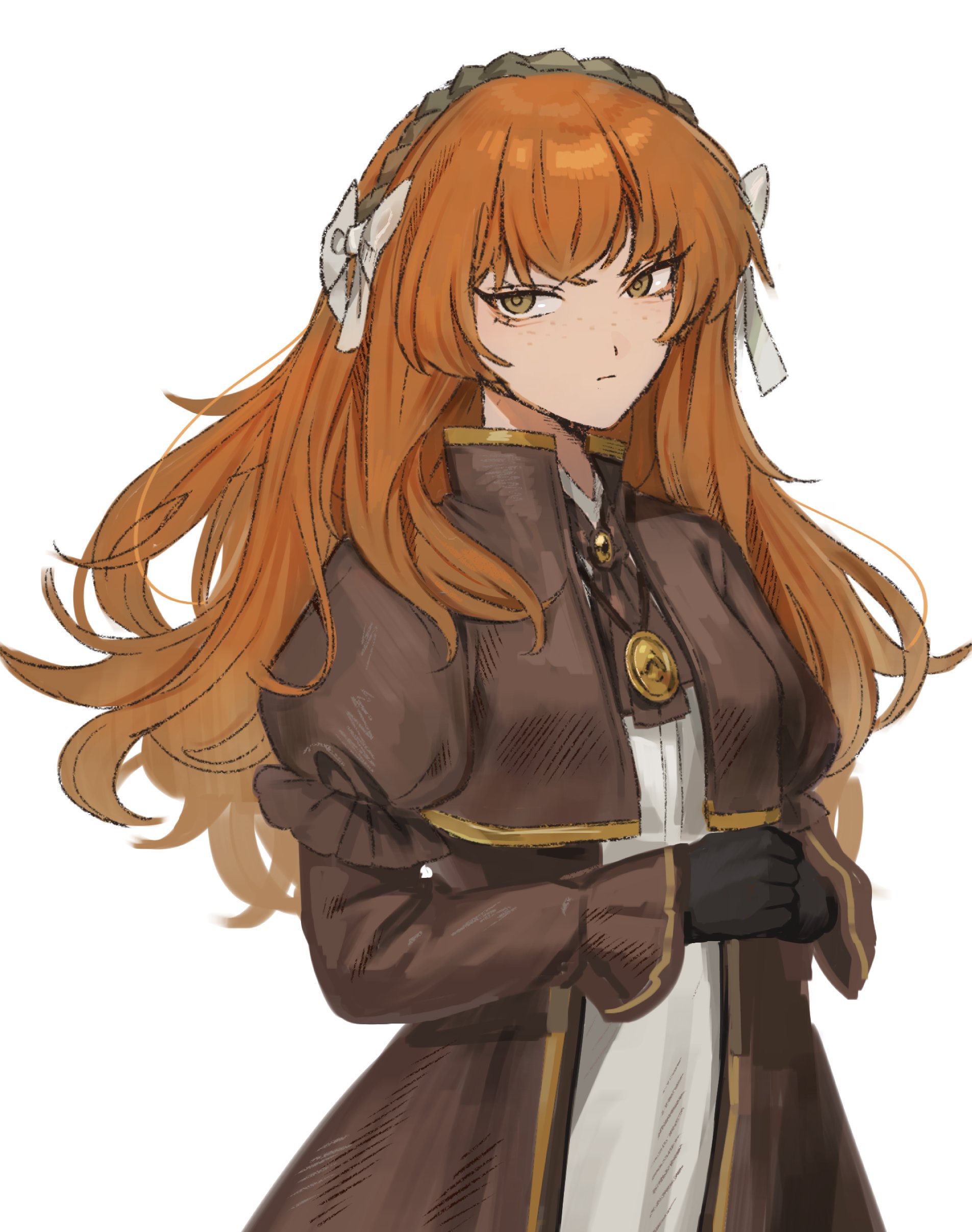 1girl absurdres ascot black_gloves bow brooch brown_ascot brown_coat catherine_(project_moon) catherine_(project_moon)_(cosplay) coat cosplay disembodied_hand dress gloves hair_bow headband highres ishmael_(project_moon) jewelry limbus_company long_hair looking_at_viewer na-gyou_(nunumaru) necklace orange_hair project_moon simple_background solo white_background white_dress yellow_eyes