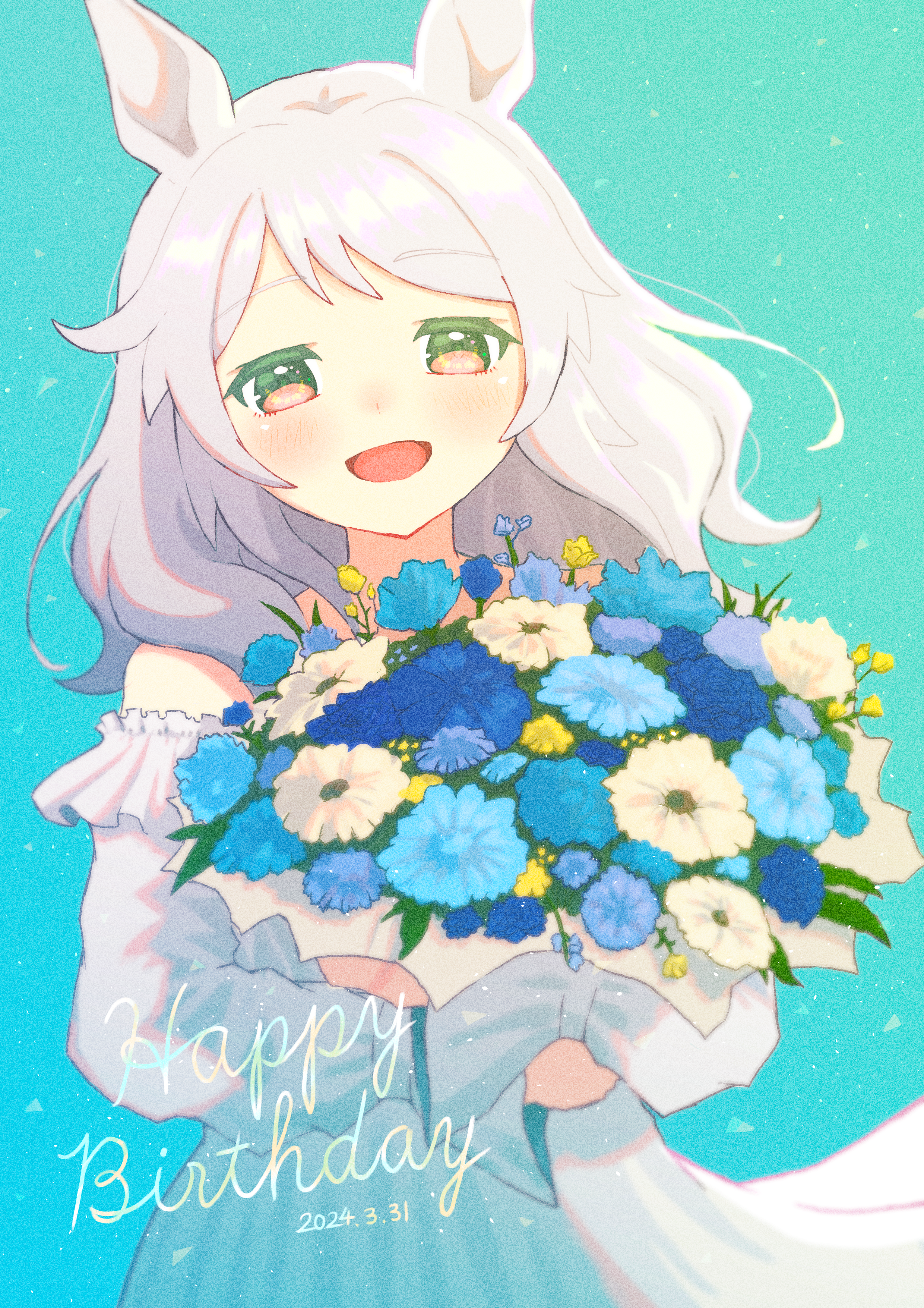 1girl absurdres animal_ears blue_dress blush bouquet dated dress flower grey_hair happy_birthday highres hishi_miracle_(umamusume) holding holding_bouquet horse_ears long_hair looking_at_viewer nenbutsu_0416 off-shoulder_dress off_shoulder open_mouth pink_eyes smile solo umamusume upper_body