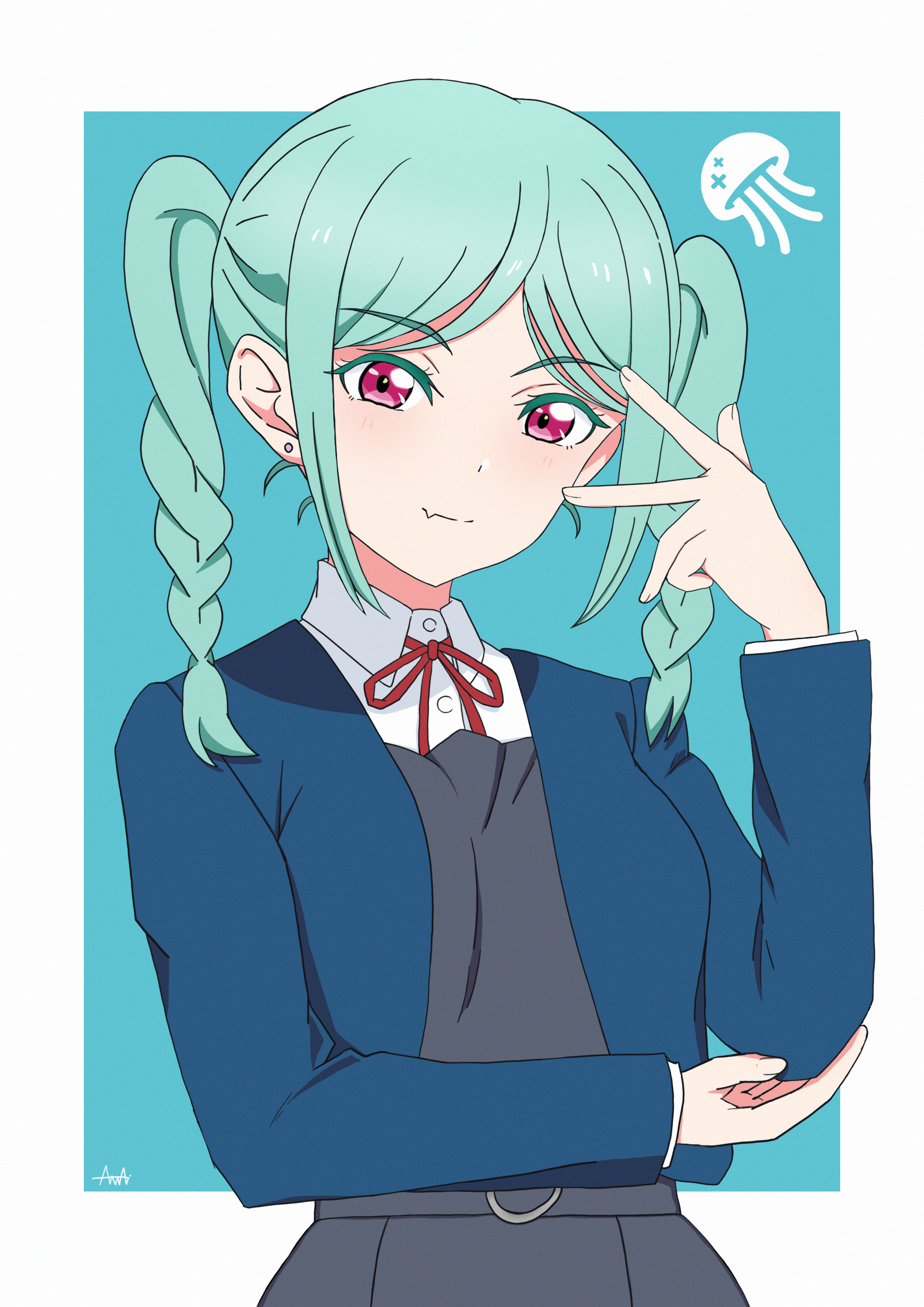 1girl absurdres aniani_ai aqua_background aqua_hair blue_jacket border braid closed_mouth collared_shirt commentary dress fang fang_out grey_dress highres jacket jellyfish long_sleeves looking_at_viewer love_live! love_live!_superstar!! neck_ribbon onitsuka_tomari outside_border pinafore_dress red_eyes red_ribbon ribbon school_uniform shirt sidelocks skin_fang sleeveless sleeveless_dress solo twin_braids twintails upper_body w w_over_eye white_border white_shirt winter_uniform yuigaoka_school_uniform