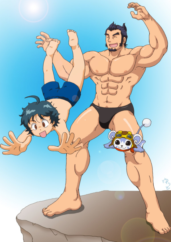 2boys black_hair black_swim_briefs blue_swim_trunks hokaze_kon ixion_saga ixion_saga_dt male_focus multiple_boys pet_(ixion_saga) sainglain_(ixion_saga_dt)