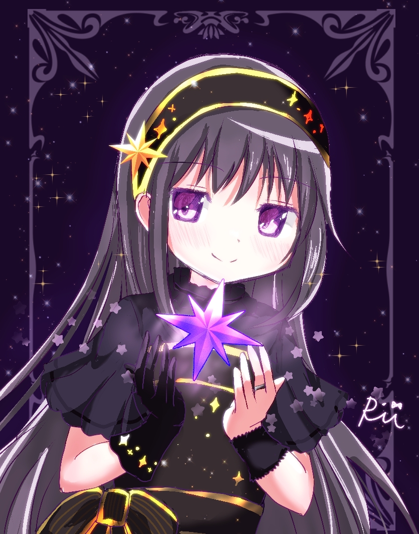 1girl akemi_homura black_dress black_hair dress long_hair looking_at_viewer mahou_shoujo_madoka_magica purple_eyes ringoo39 short_sleeves smile solo