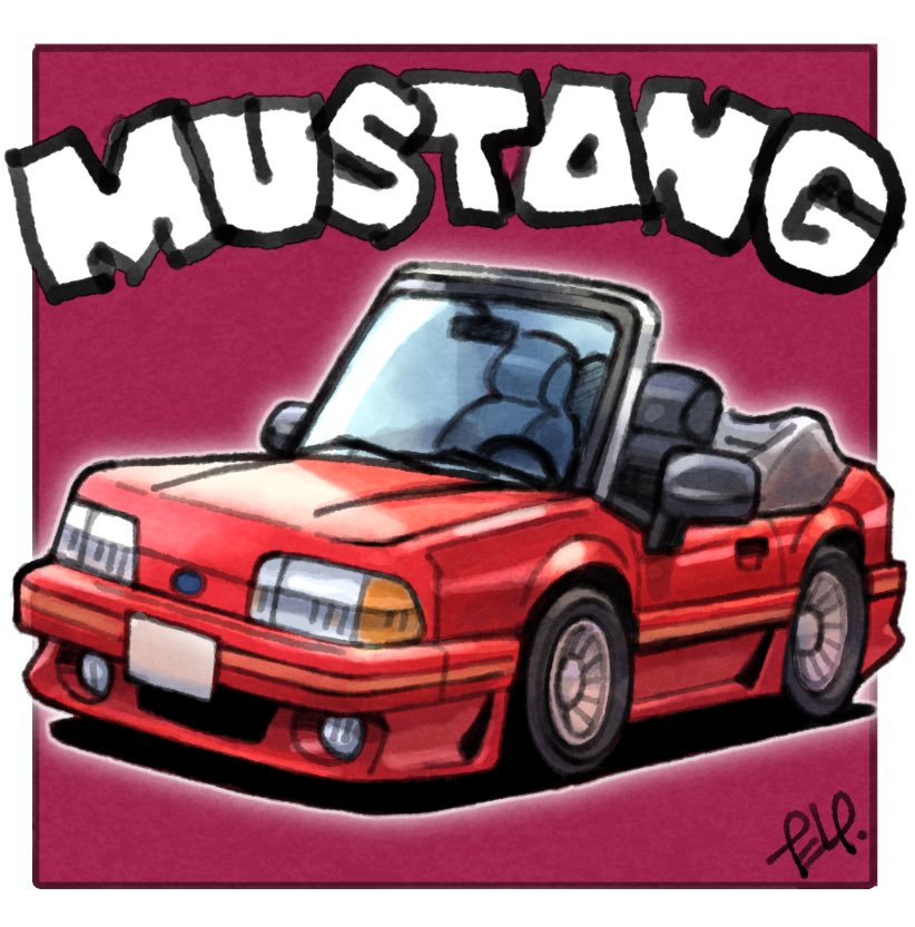 border car chibi convertible ford ford_mustang ford_mustang_(foxbody) motor_vehicle no_humans original outside_border red_background steering_wheel takedake_(motion_animator) vehicle_focus vehicle_name white_border