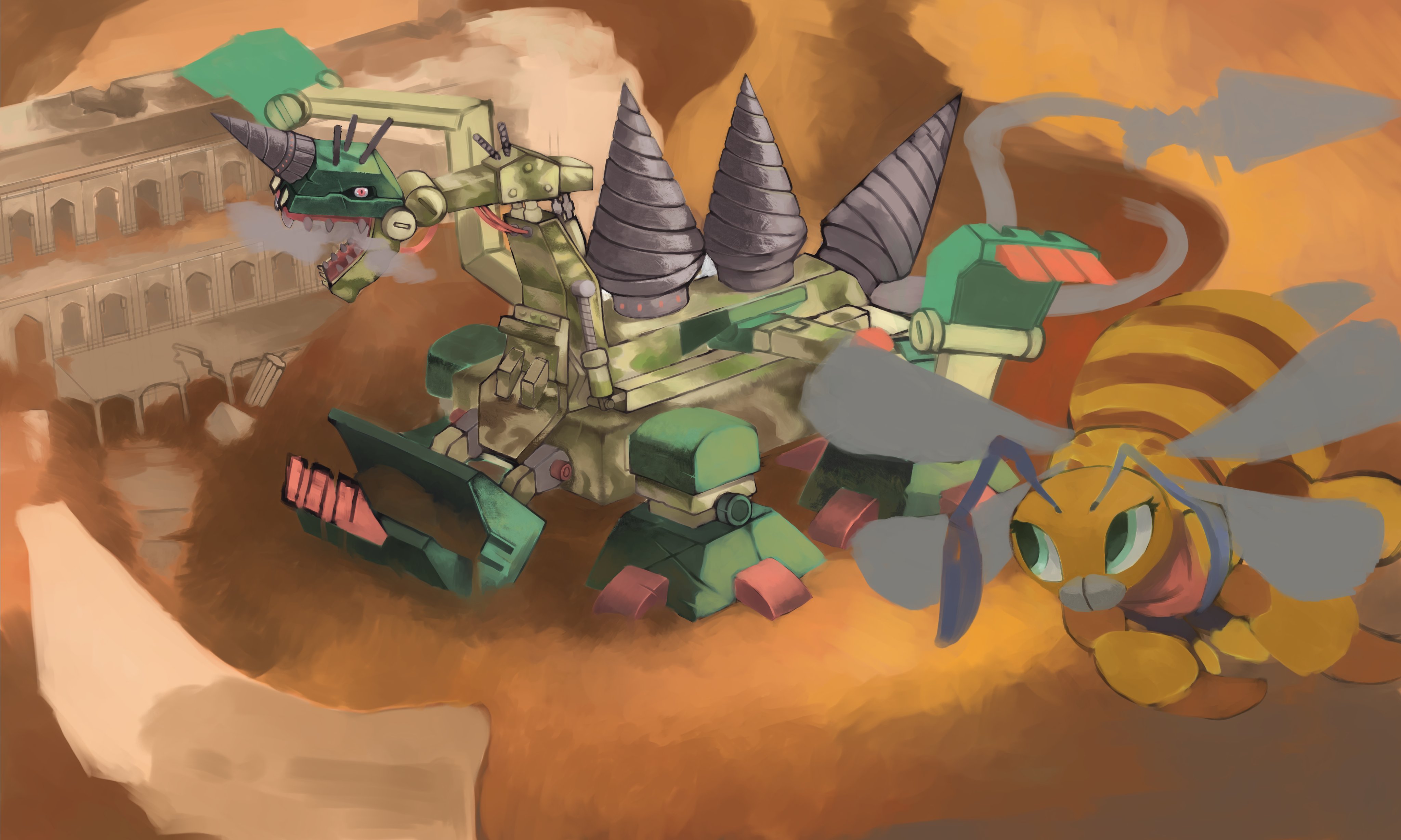 absurdres breakdramon bug digimon digimon_(creature) dragon drill funbeemon highres open_mouth sand wings