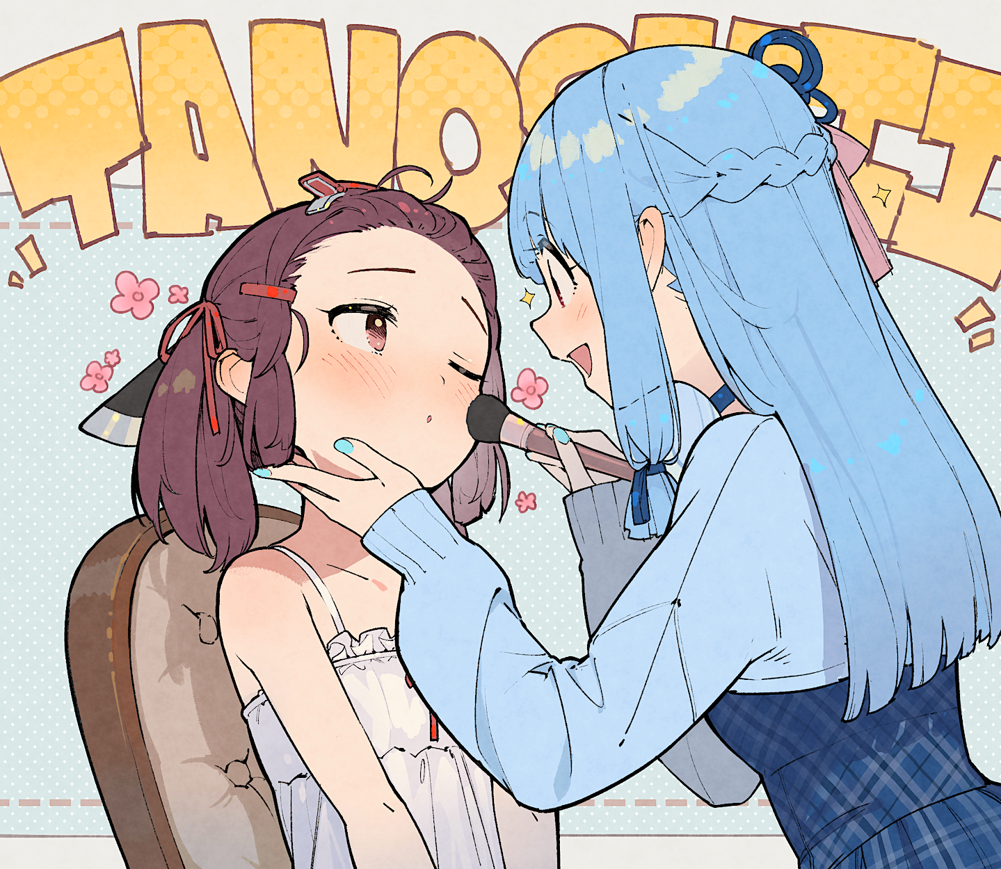 2girls applying_makeup aqua_nails bangs_pinned_back blue_ribbon blush braid flower french_braid hair_ornament hair_ribbon hairclip hand_on_another's_chin highres holding holding_brush kotonoha_aoi long_hair looking_at_another low-tied_sidelocks makeup makeup_brush multiple_girls nail_polish one_eye_closed pink_flower red_ribbon ribbon shirinda_fureiru short_hair sidelocks touhoku_kiritan upper_body voiceroid