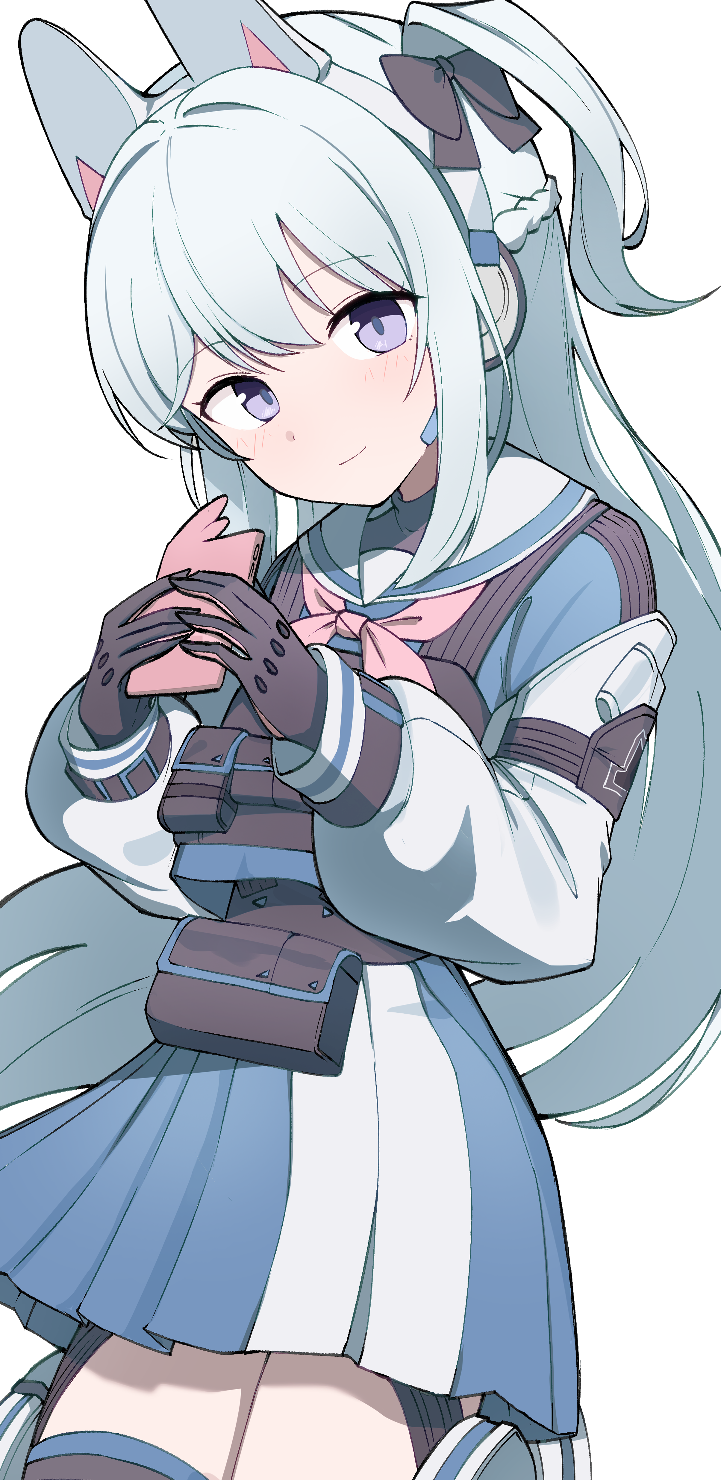 1girl absurdres animal_ears black_gloves blue_archive blue_serafuku blue_skirt cellphone closed_mouth cowboy_shot earpiece fake_animal_ears gloves grey_hair highres holding holding_phone lil_monster_(zbuta_turatan) long_hair long_sleeves looking_at_viewer miyako_(blue_archive) neckerchief one_side_up phone pink_neckerchief pleated_skirt purple_eyes rabbit_ears sailor_collar school_uniform serafuku simple_background skirt smartphone smile solo two-tone_skirt white_background white_sailor_collar