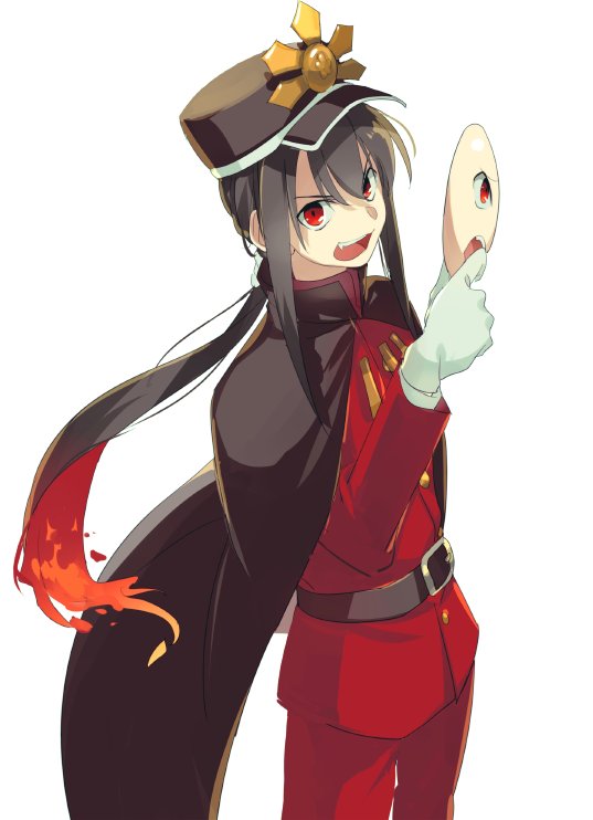 1boy belt black_cape black_hair black_hat buttons cape crest echo_(circa) family_crest fate/grand_order fate_(series) fiery_hair gloves hat jacket jewelry koha-ace long_hair long_sleeves looking_at_viewer mask necklace oda_nobukatsu_(fate) oda_uri open_mouth pants peaked_cap ponytail red_eyes red_jacket red_pants sidelocks smile solo very_long_hair white_gloves