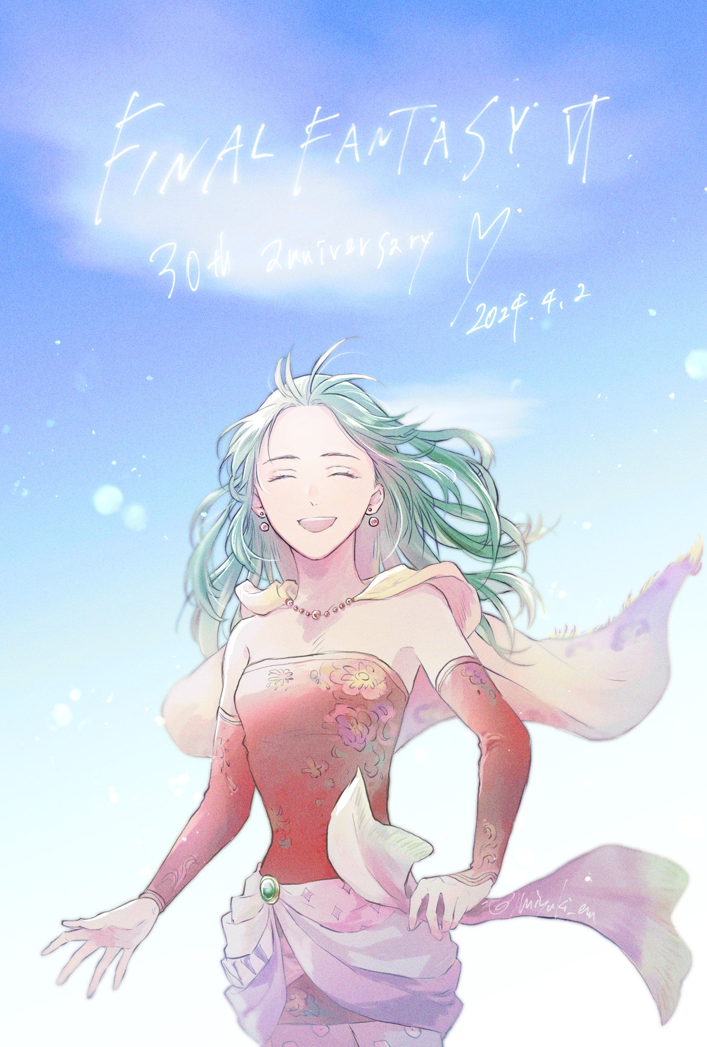 1girl 2024 :d ^_^ animal_ears anniversary cape closed_eyes copyright_name cowboy_shot dated detached_sleeves dress earrings final_fantasy final_fantasy_vi floral_print floral_print_dress green_hair hair_down highres jewelry legs_together long_hair long_sleeves mi_(matilda-mc) open_mouth print_dress red_dress red_sleeves short_dress smile solo standing strapless strapless_dress teeth tina_branford tube_dress twitter_username upper_teeth_only yellow_cape