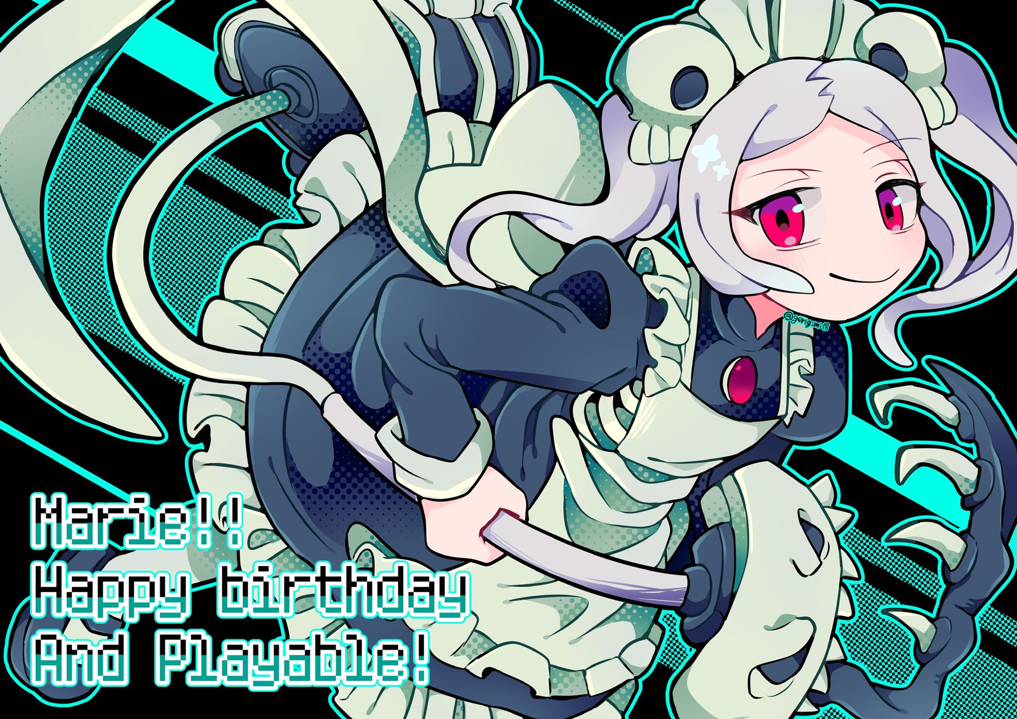 1girl apron birthday black_background bloody_marie_(skullgirls) blue_background brooch dress frilled_apron frilled_dress frills gerigimi18 grey_hair hair_ornament highres jewelry juliet_sleeves long_sleeves looking_at_viewer maid_headdress pantyhose puffy_sleeves red_eyes skull_hair_ornament skullgirls smile solo twintails vacuum_cleaner