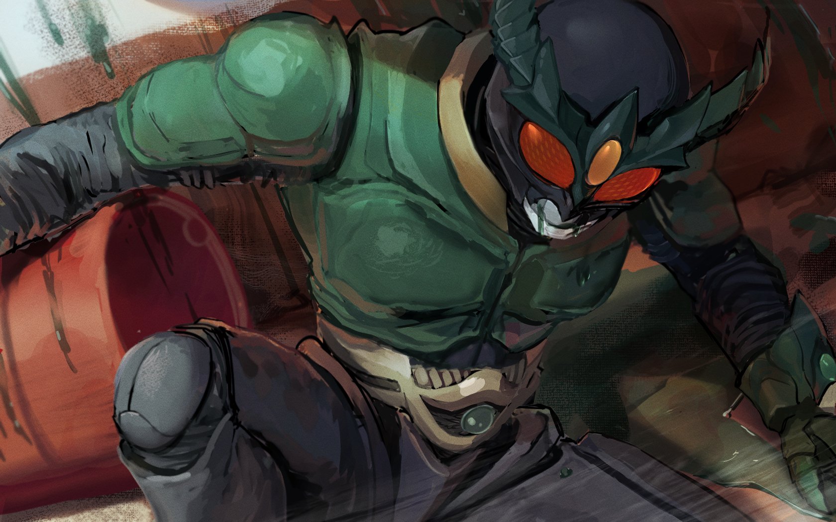 1boy armor belt black_bodysuit bodysuit bug cape drum_(container) gauntlets gloves green_armor green_cape green_horns highres horns ikanyoikanikan kamen_rider kamen_rider_agito_(series) kamen_rider_gills looking_at_viewer male_focus red_eyes rider_belt solo tokusatsu
