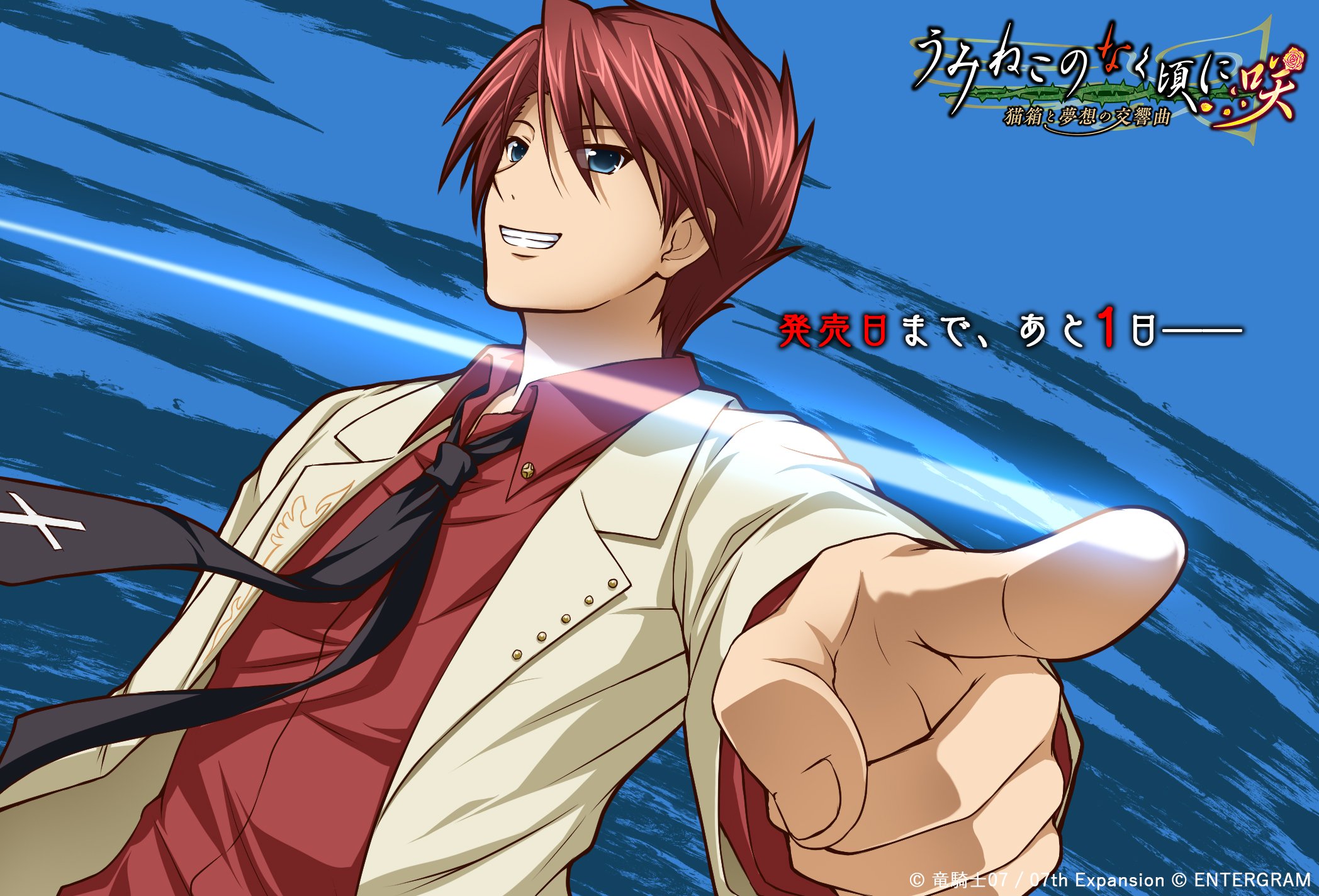 1boy black_necktie blue_background blue_eyes buttons collared_shirt company_name copyright_name cross dress_shirt formal_clothes grin highres jacket logo long_sleeves looking_at_viewer male_focus necktie official_art open_clothes open_jacket ougon_musou_kyoku parted_bangs pointing pointing_at_viewer red_hair red_shirt shirt short_hair smile solo suit tsuda_akira umineko_no_naku_koro_ni ushiromiya_battler yellow_jacket