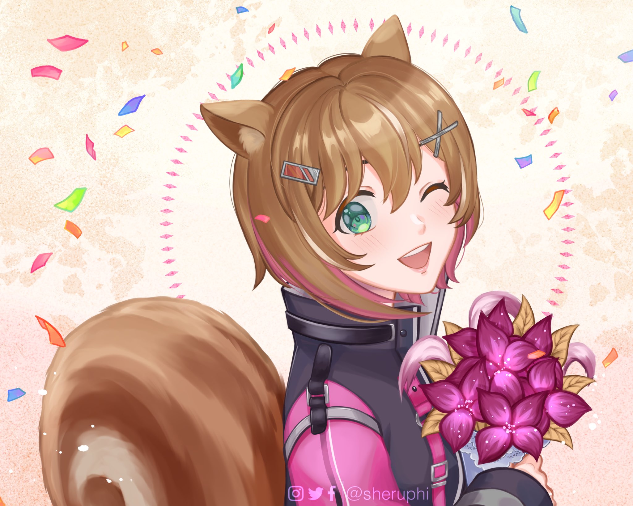 1girl animal_ears ayunda_risu ayunda_risu_(cyberpunk) black_jacket blush bouquet brown_hair commentary confetti english_commentary flower from_side hair_ornament hairclip highres holding holding_bouquet hololive hololive_indonesia jacket long_sleeves multicolored_hair official_alternate_costume one_eye_closed open_mouth pink_sleeves purple_flower sheruphi short_hair sleeves_past_wrists smile solo squirrel_ears squirrel_girl squirrel_tail streaked_hair tail virtual_youtuber