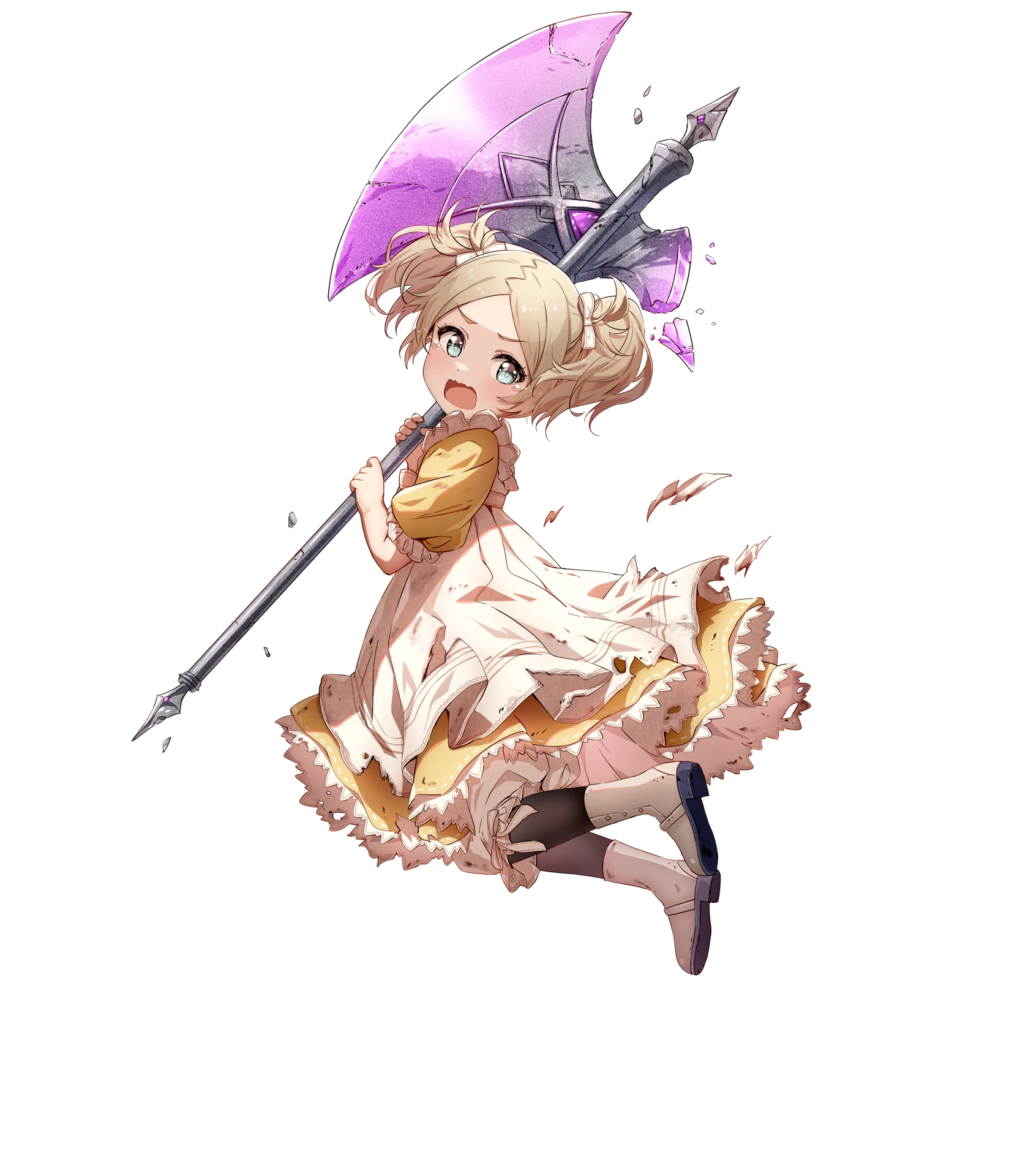 1girl aged_down axe blonde_hair bloomers bloomers_(victorian) damaged dress fire_emblem fire_emblem_awakening fire_emblem_heroes frilled_dress frills green_eyes hair_ribbon highres holding holding_axe lissa_(young)_(fire_emblem) lissa_(fire_emblem) nintendo non-web_source open_mouth ribbon solo torn_clothes torn_dress twintails underwear wavy_mouth white_footwear yellow_dress