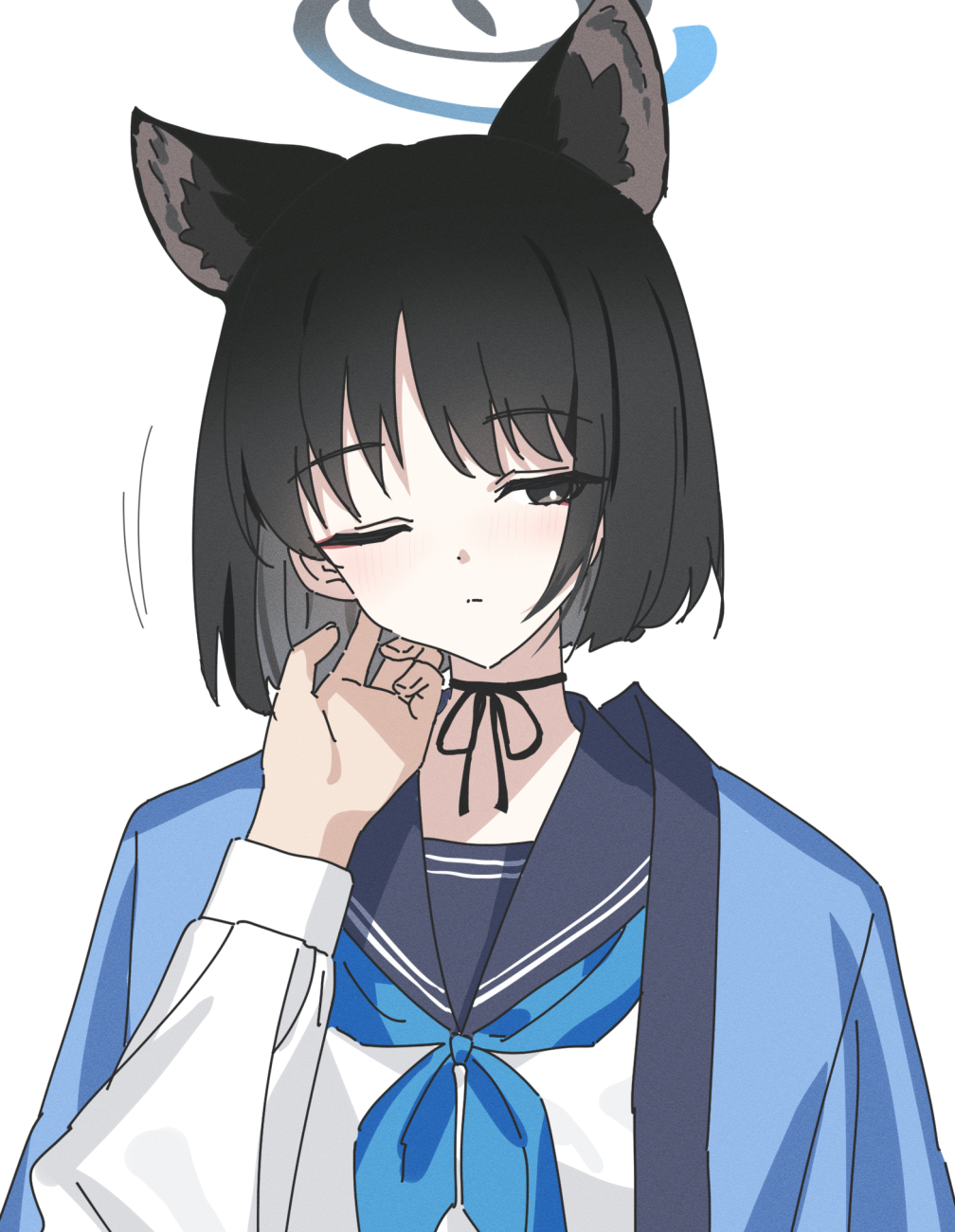 1boy 1girl animal_ears averting_eyes black_hair black_ribbon blue_archive blue_neckerchief blush cat_ears extra_ears halo haori hetero highres japanese_clothes kikyou_(blue_archive) neck_ribbon neckerchief nekoln one_eye_closed ribbon school_uniform sensei_(blue_archive) serafuku short_hair simple_background upper_body white_background