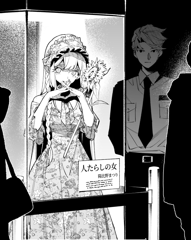 1boy 1girl bad_id bad_twitter_id collared_shirt display_case dress floral_print flower greyscale hairband hands_up hibino_matsuri hibino_matsuri_(primagista) ibuki_touma ibuki_touma_(primagista) in_container indoors lolita_hairband long_hair long_sleeves looking_at_viewer monochrome museum necktie pants people pretty_series shirt short_hair sign smile standing sunflower translation_request waccha_primagi! zashima