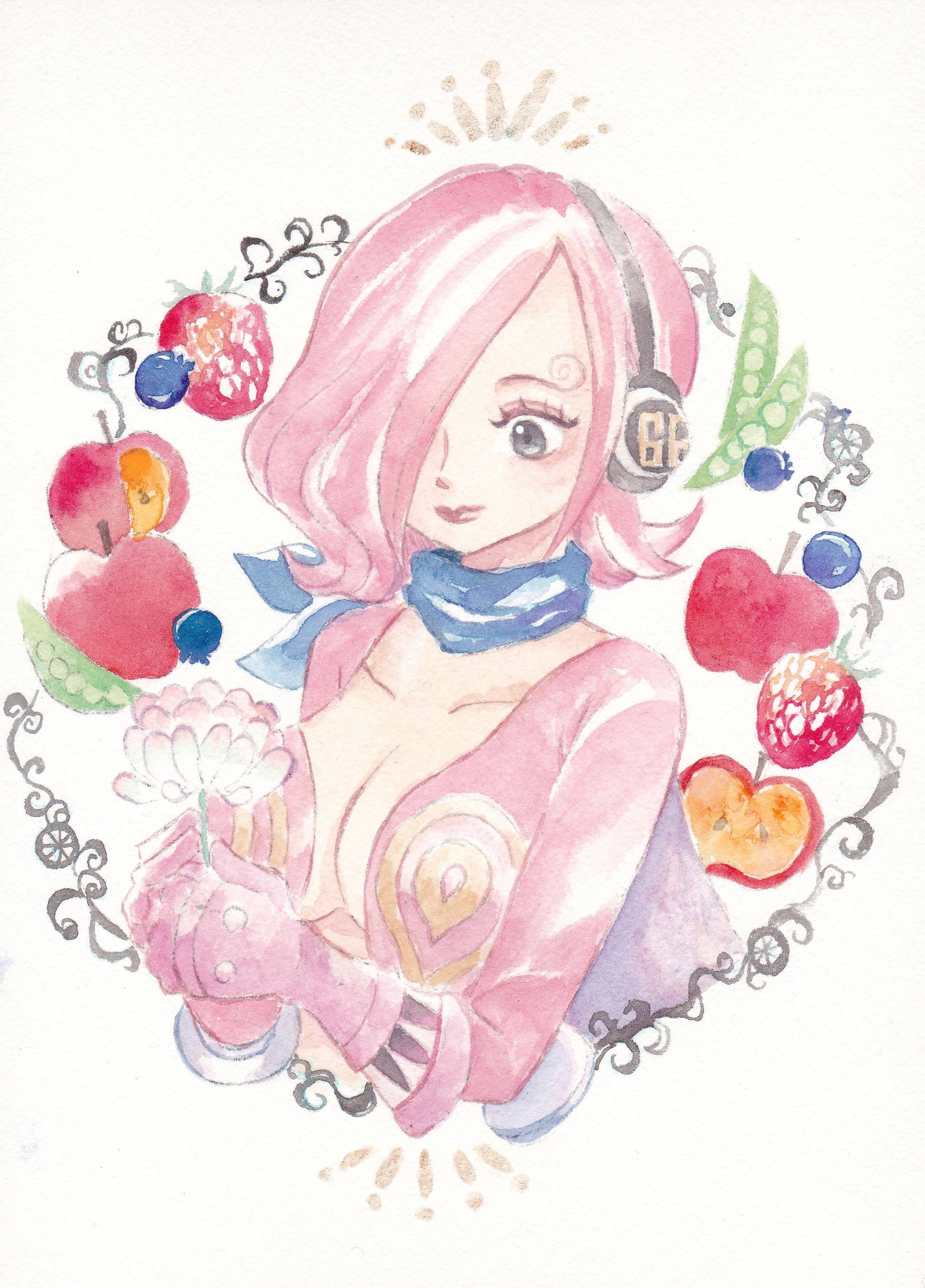 1girl absurdres apple blue_neckerchief commentary_request curly_eyebrows flower food fruit gloves hair_over_one_eye highres holding holding_flower looking_down neckerchief one_piece pink_gloves pink_hair plunging_neckline short_hair simple_background solo strawberry upper_body vinsmoke_reiju yachiy0