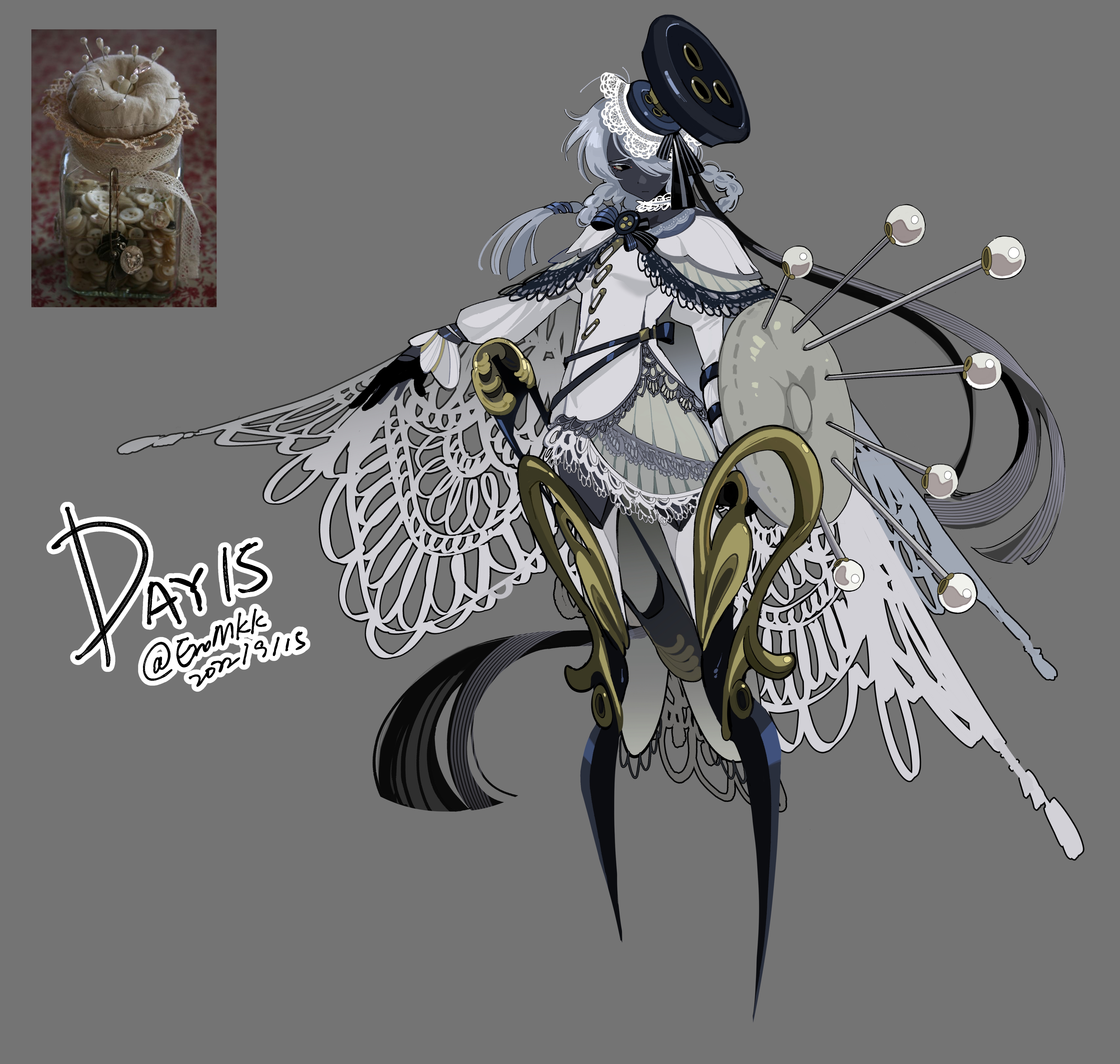 1girl absurdres artist_name black_bow black_bowtie black_sclera black_skin bow bowtie braid buttons cape capelet chinese_commentary colored_sclera colored_skin commentary_request dated eromkk frown full_body grey_background grey_hair hair_over_one_eye hair_ribbon hair_rings highres jacket jar lace-trimmed_capelet lace-trimmed_headwear lace-trimmed_jacket lace_cape lace_trim looking_to_the_side medium_hair one_eye_covered original personification photo_inset pin pincushion reference_inset ribbon shield sideways_glance signature simple_background solo standing striped_bow striped_bowtie striped_clothes twin_braids white_cape white_capelet white_eyes white_jacket
