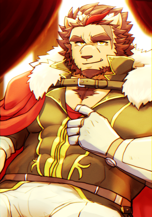 1boy animal_ears bara beard brown_hair cape chest_tuft chinstrap_beard clothes_pull covered_abs crave_saga crown curtains facial_hair fur-trimmed_cape fur_trim gauntlets karaha_(crave_saga) lion_boy lion_ears looking_at_viewer male_focus multicolored_hair muscular muscular_male nattukre pants pectoral_cleavage pectorals red_hair scar scar_on_face shirt_pull sitting solo thick_eyebrows tusks two-tone_hair white_pants