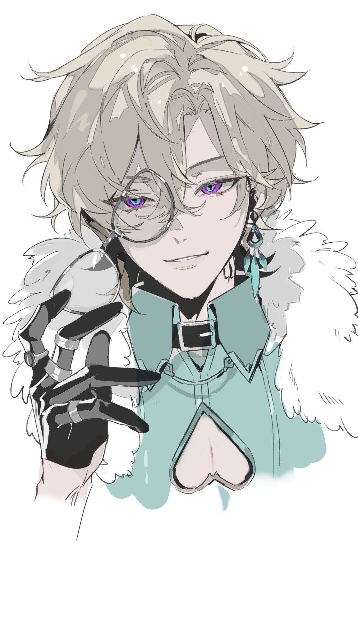 1boy aqua_shirt aventurine_(honkai:_star_rail) black_gloves blonde_hair collared_shirt earrings fur_trim glasses gloves hair_between_eyes highres honkai:_star_rail honkai_(series) jewelry male_focus multicolored_eyes portrait shirt short_hair simple_background solo unworn_eyewear violetpuppy1 white_background