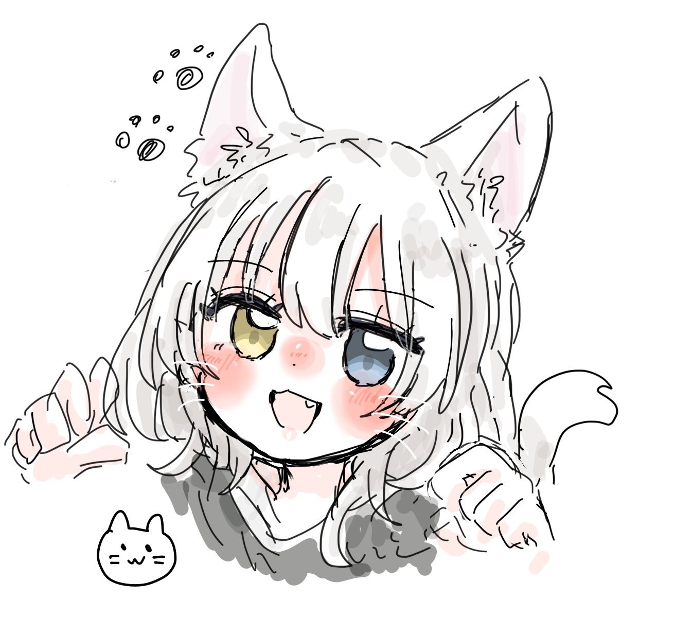 1girl :3 animal_ears bang_dream! bang_dream!_it's_mygo!!!!! blue_eyes blush cat_ears cat_girl cat_tail commentary_request fang heterochromia kaname_raana open_mouth paw_pose same_(same_d4) short_hair simple_background solo tail white_background white_hair yellow_eyes