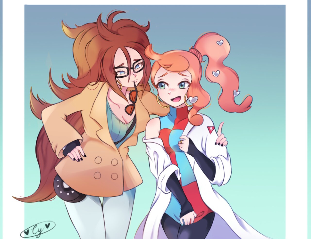 2girls android_21 android_21_(cosplay) aqua_eyes aqua_nails aqua_shirt black-framed_eyewear black_nails black_pantyhose blue_dress blue_eyes bracelet breasts brown_coat brown_hair checkered_clothes checkered_dress cleavage coat collarbone cosplay costume_switch crossover denim dragon_ball dragon_ball_fighterz dress earrings eyewear_in_mouth eyewear_on_head glasses hair_ornament hand_on_another's_shoulder hand_on_own_hip head_tilt heart heart_hair_ornament hoop_earrings jeans jewelry krystalstar70 lab_coat large_breasts light_persona long_hair medium_breasts mouth_hold multiple_girls nintendo orange-tinted_eyewear orange_hair pants pantyhose parted_hair pokemon pokemon_swsh raised_eyebrows red_dress ribbed_shirt ring shirt short_dress side_ponytail simple_background sonia_(pokemon) sonia_(pokemon)_(cosplay) sunglasses swept_bangs tinted_eyewear two-tone_dress v-neck wavy_hair