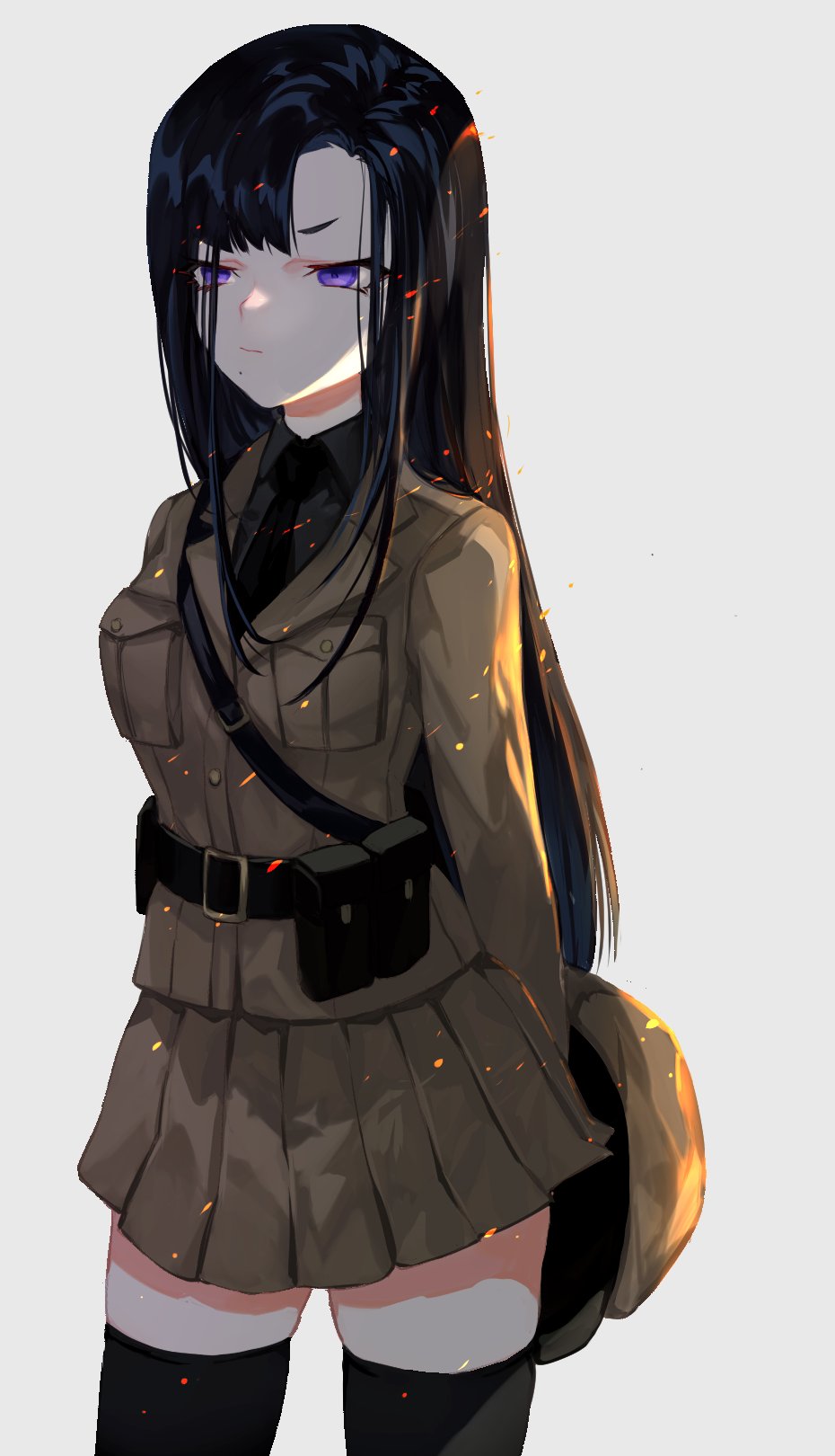 asymmetrical_bangs black_hair black_shirt black_thighhighs brown_skirt collared_leotard collared_shirt eunhwa_(nikke) forehead goddess_of_victory:_nikke hat highres holding holding_unworn_clothes holding_unworn_hat jacket long_hair military_jacket purple_eyes sakae_nikebaraba shirt skirt thighhighs unworn_hat unworn_headwear
