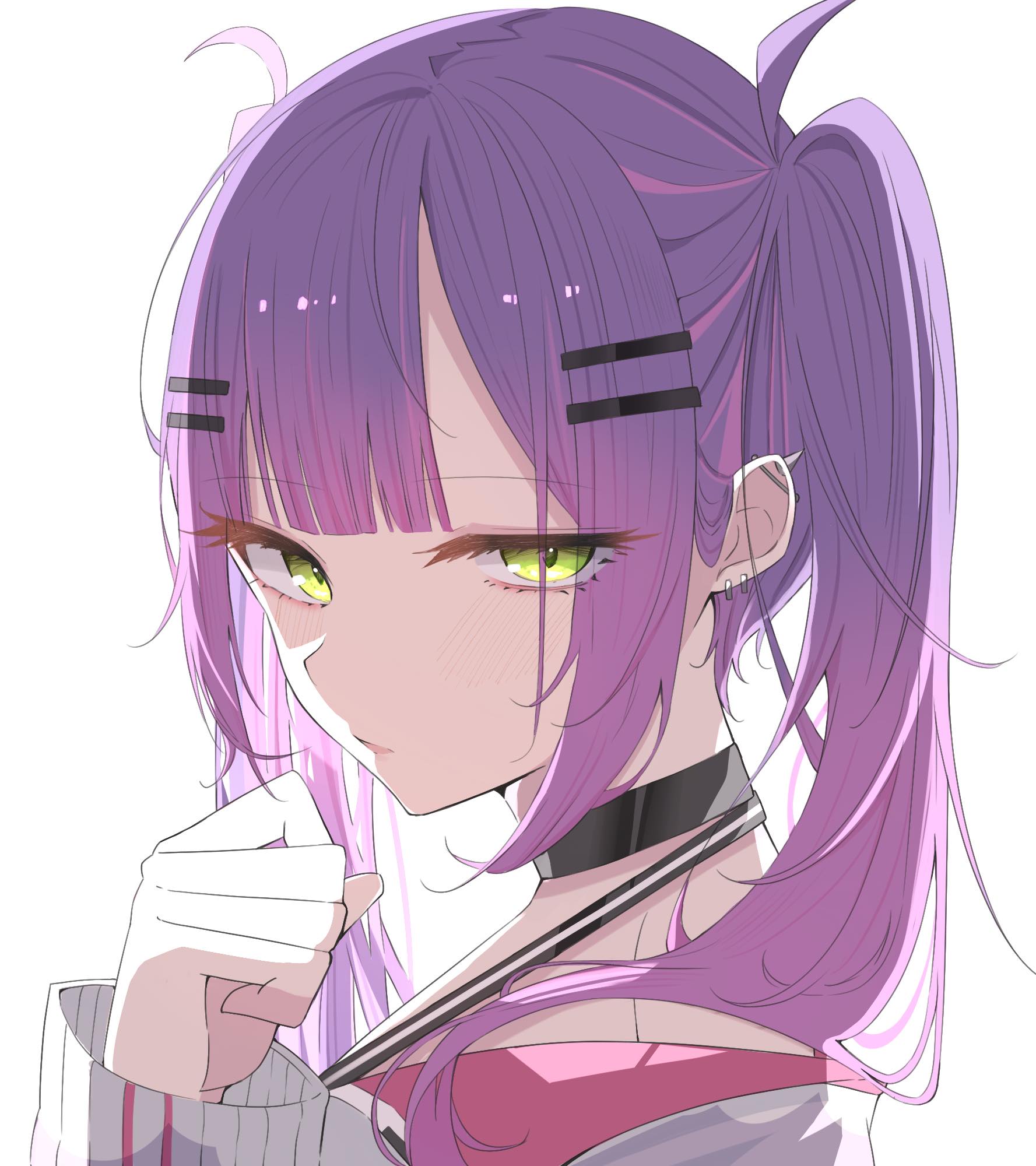 1girl black_choker choker clenched_hand dreamoon earrings from_side gradient_hair green_eyes hair_ornament hairclip hand_up highres hololive jacket jewelry long_hair long_sleeves looking_at_viewer multicolored_hair open_mouth pink_hair portrait purple_hair simple_background solo streaked_hair tokoyami_towa tokoyami_towa_(jirai_kei) twintails virtual_youtuber white_background white_jacket