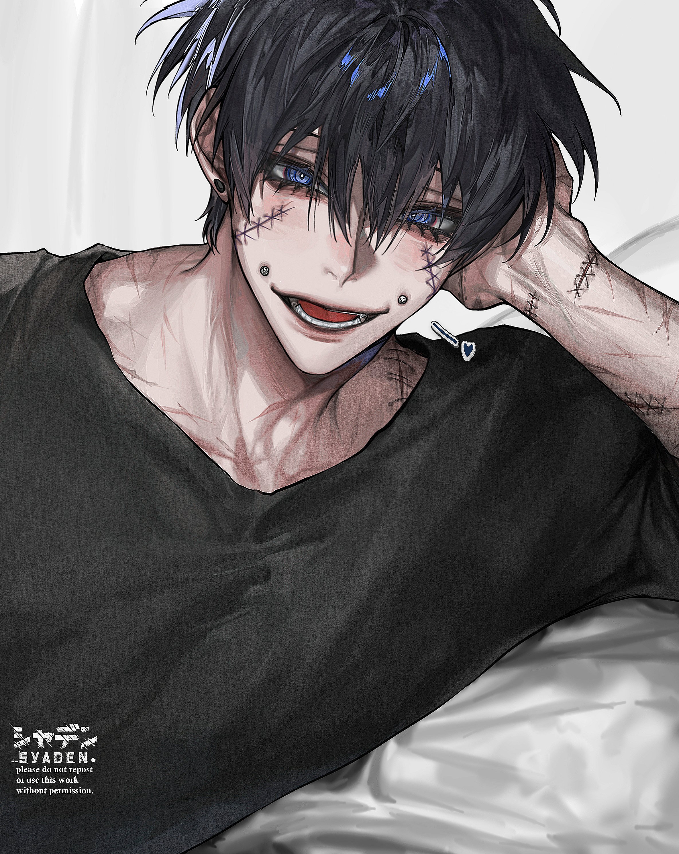 1boy absurdres bed_sheet black_hair black_shirt blue_eyes ear_piercing eyelashes hair_between_eyes hand_to_head hand_up head_rest highres light_blush looking_at_viewer lower_teeth_only lying male_focus on_bed on_side original parted_lips piercing scar scar_on_arm scar_on_shoulder shirt short_hair smile solo stitched_arm stitched_face stitched_torso stitches syaden teeth tongue