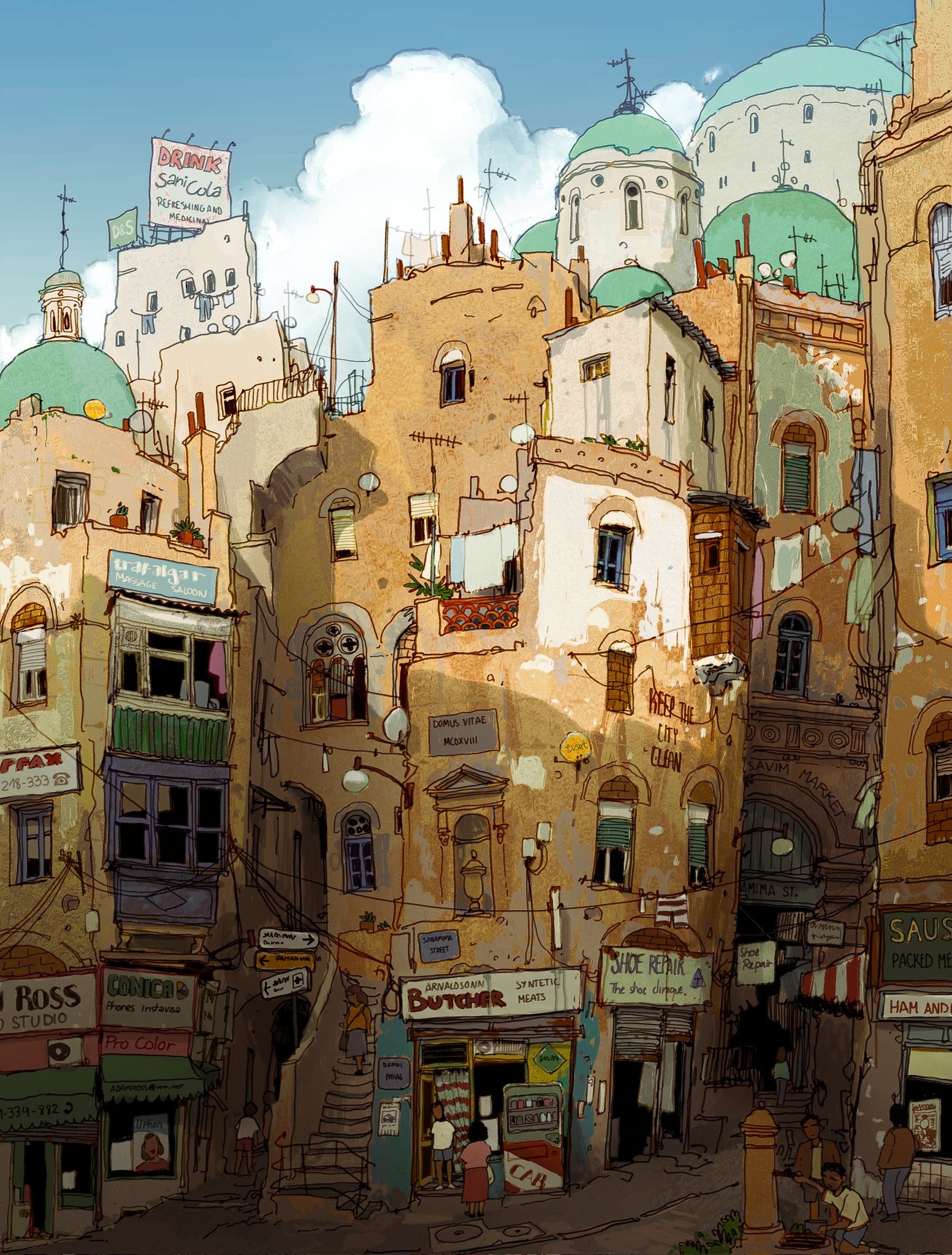 absurdly_detailed_composition ad air_conditioner alariko arch awning balcony billboard blue_sky building chimney city clothesline cloud color_banding complex_exterior day display dome english_text fantasy highres latin_text original outdoors people plant power_lines railing road scenery shop sign sky stairs storefront street vending_machine very_wide_shot well