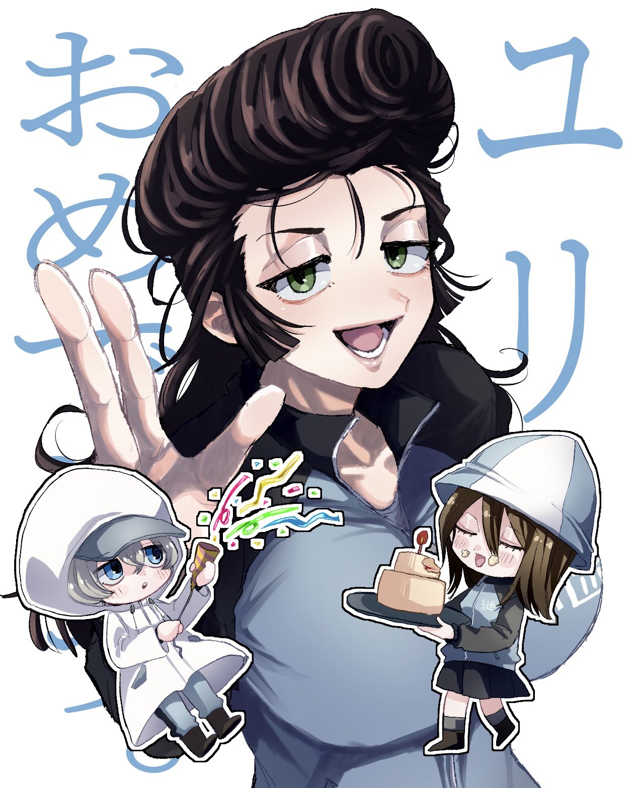 3girls birthday black_hair blue_eyes breasts brown_hair cake character_request eikfc8 food girls_und_panzer green_eyes happy_birthday highres keizoku_military_uniform large_breasts mika_(girls_und_panzer) multiple_girls pompadour white_background white_hair women's_pompadour yuri_(girls_und_panzer)