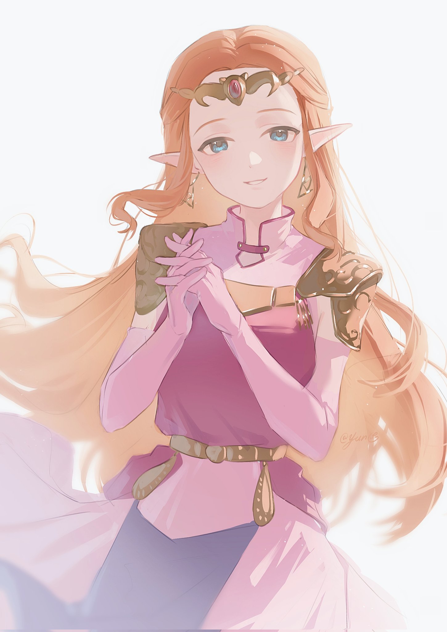 1girl armor blonde_hair blue_eyes blush dress earrings elbow_gloves gloves highres jewelry long_hair nintendo pink_dress pointy_ears princess princess_zelda shoulder_armor the_legend_of_zelda the_legend_of_zelda:_ocarina_of_time triforce white_background yun_(dl2n5c7kbh8ihcx)