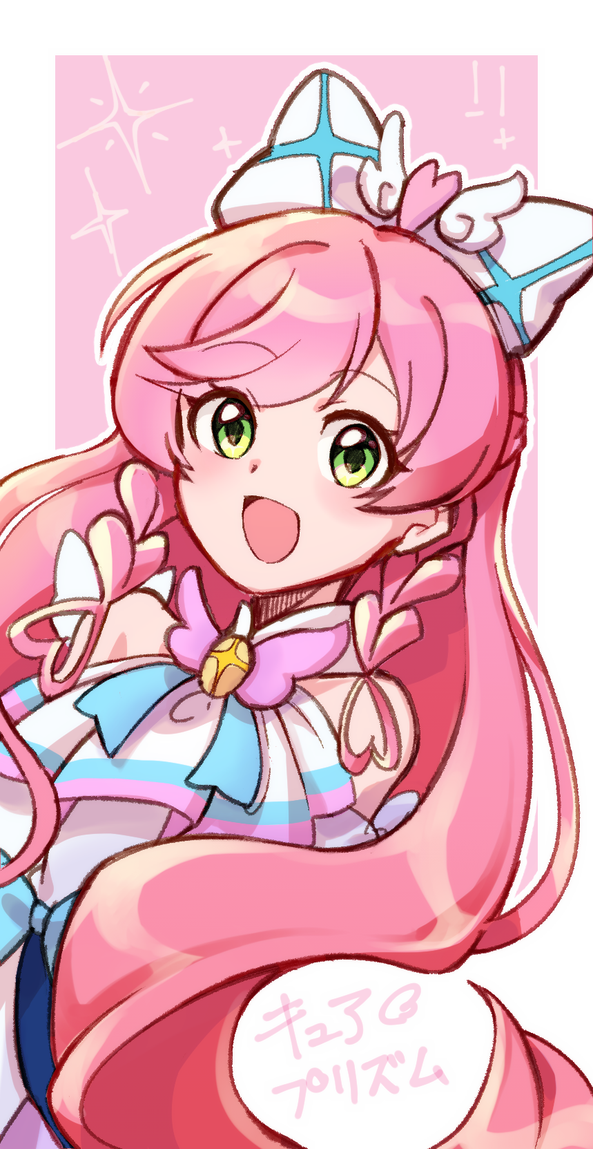 1girl ascot bow braid brooch character_name commentary cure_prism dress green_eyes hair_bow highres hirogaru_sky!_precure jewelry long_hair looking_at_viewer magical_girl multiwhite nijigaoka_mashiro open_mouth pink_hair precure side_braids sleeveless sleeveless_dress smile solo sparkle translated very_long_hair white_ascot white_bow white_dress wing_brooch