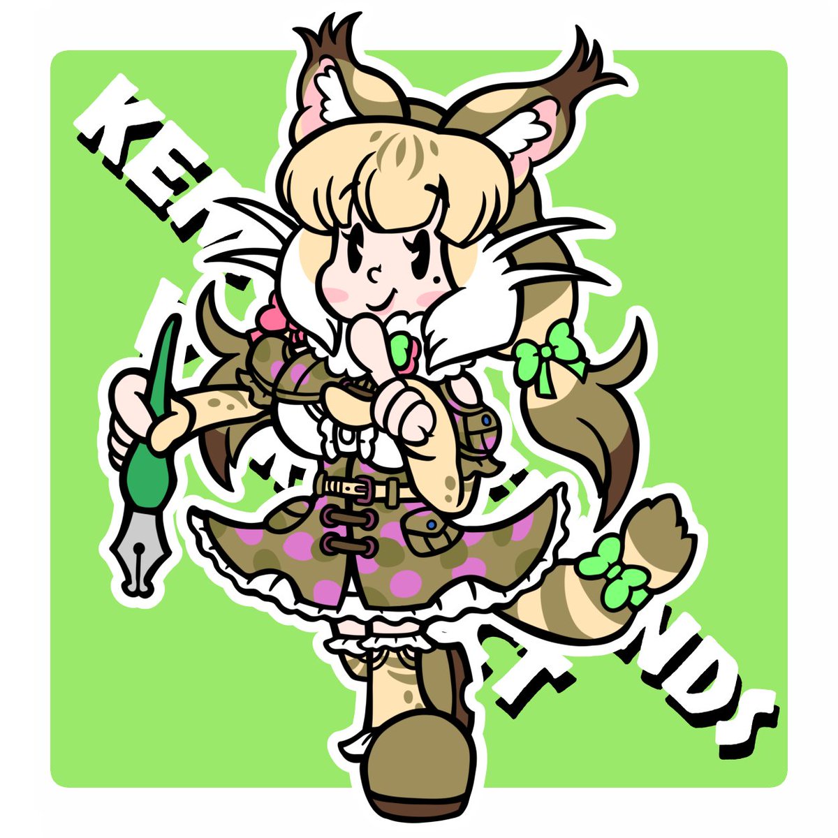 1girl animal_ears brown_shoes camouflage cat_ears cat_girl cat_tail elbow_gloves extra_ears fingerless_gloves full_body gloves green_background grey_hair highres jacket jungle_cat_(kemono_friends) kemono_friends kemono_friends_v_project long_hair looking_at_viewer microphone pen r1chardroe ribbon shirt shoes simple_background skirt solo tail thighhighs twintails virtual_youtuber